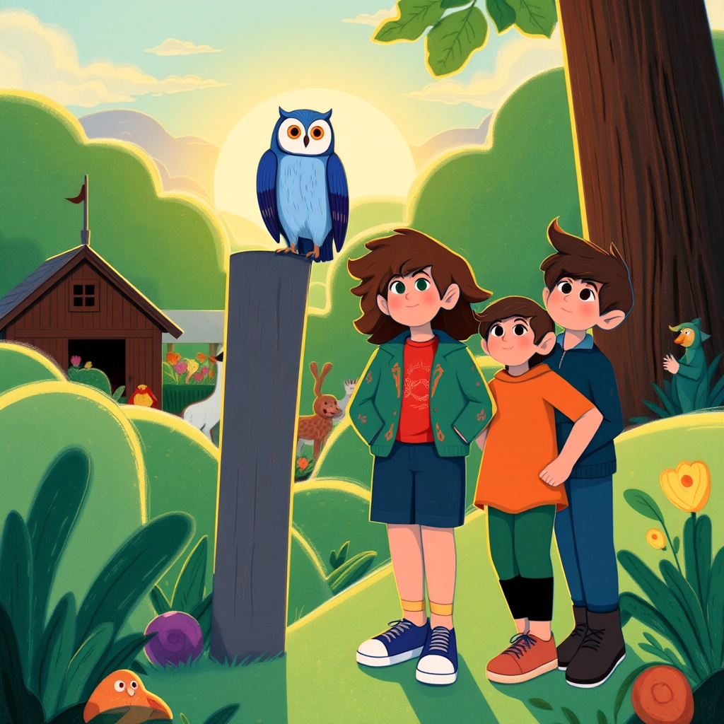 They were greeted by a talking owl with shimmering blue feathers. 'Welcome! I am [Percival](W6PM7PDH),' he said. 'Here, every creature has a lesson to share.'
