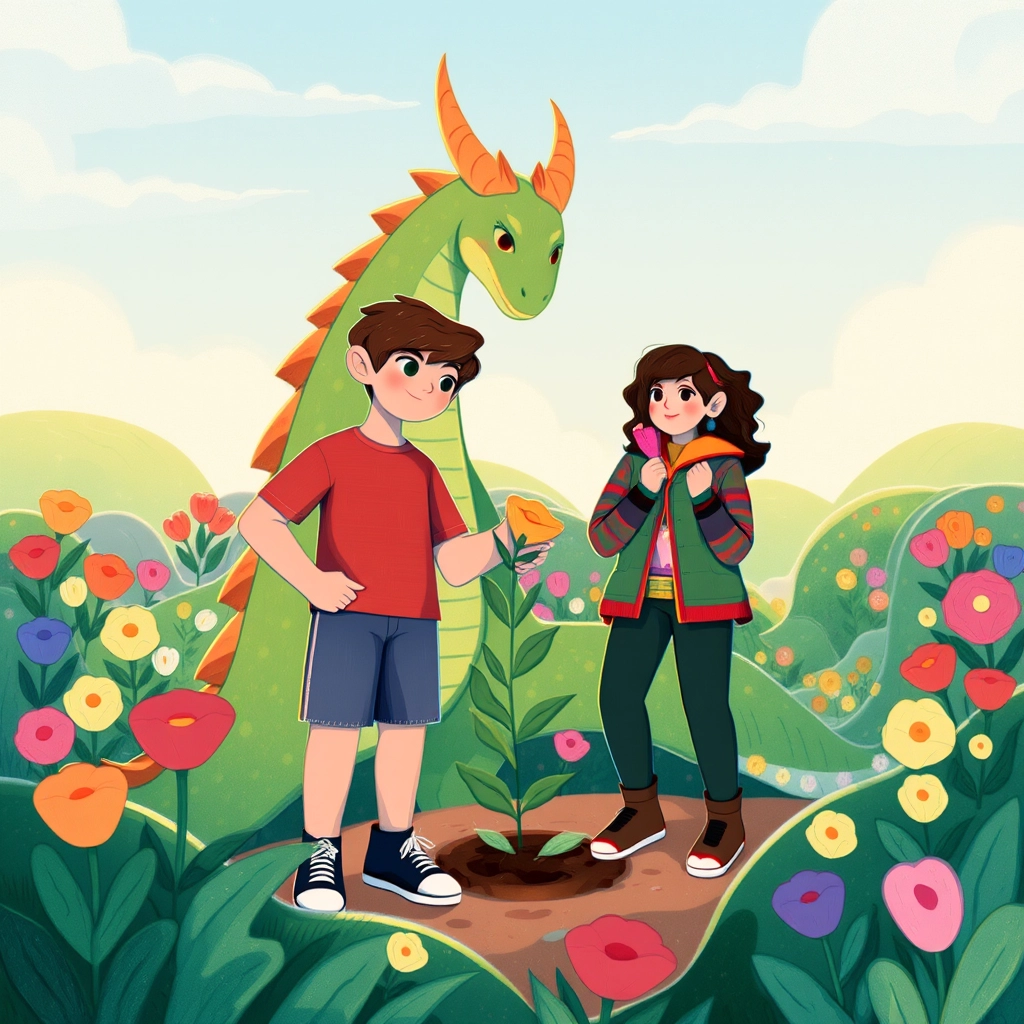 In a lush garden, they met [Flora](KJ6J9F9V), a towering green dragon with scales shimmering like emeralds. She shared wisdom about the importance of planting trees and protecting nature.