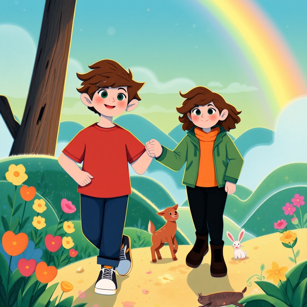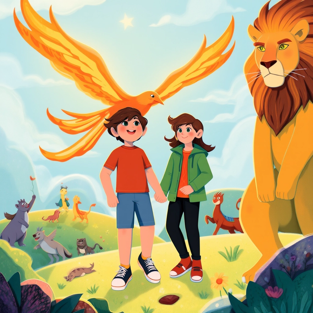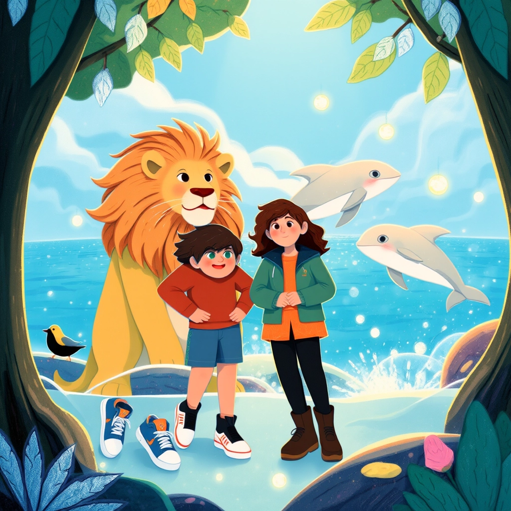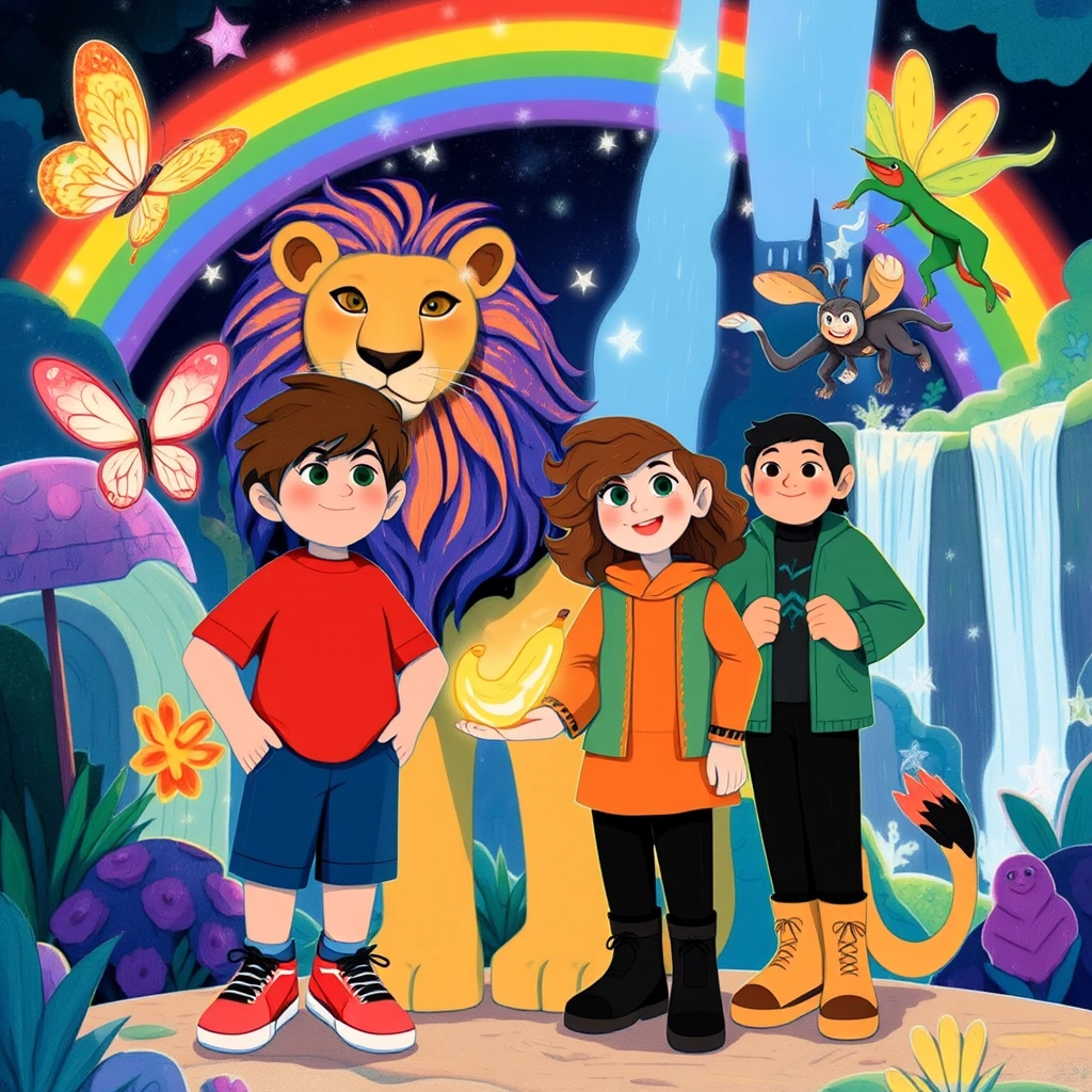 Once inside, they met [Lionel](HD993WFB), a lion with a mane that shimmered like rainbows. 'Welcome! Kindness is rewarded here,' he said.