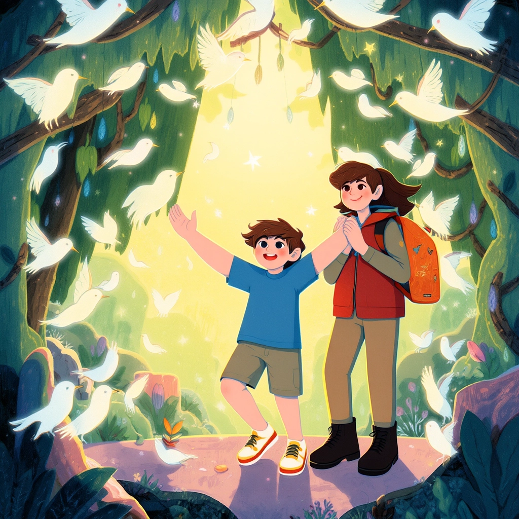 In the aviary, a flock of tiny birds made of light danced joyfully in the air, creating music with the flutters of their glowing wings. [Emory](BQTW9327) twirled with the birds, laughing as they sparkled like fireworks.