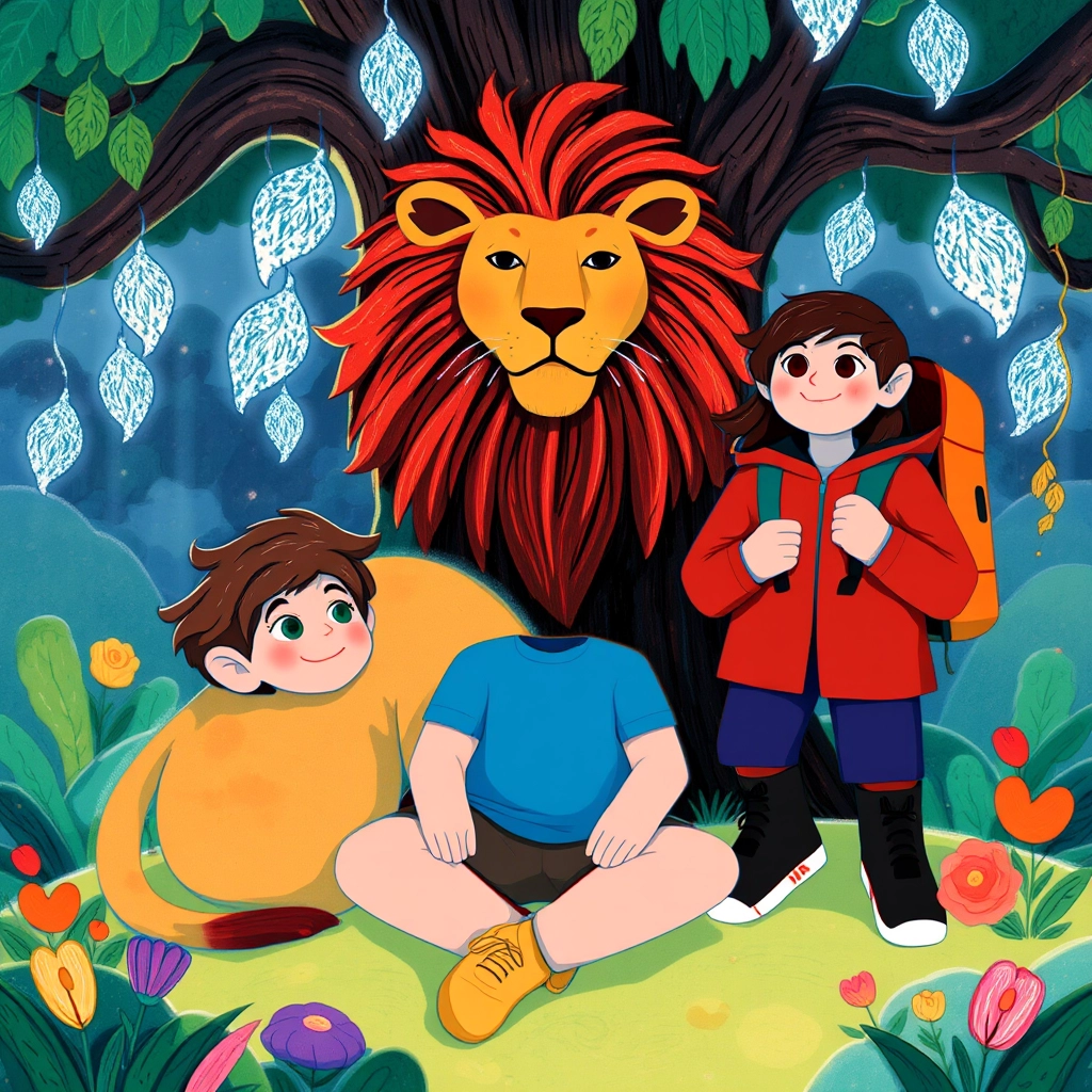 As they wandered further, they met a friendly rainbow-striped lion lounging under a glittering tree with silver leaves. 'Hello, travelers!' it roared kindly. 'Care to hear a riddle?'