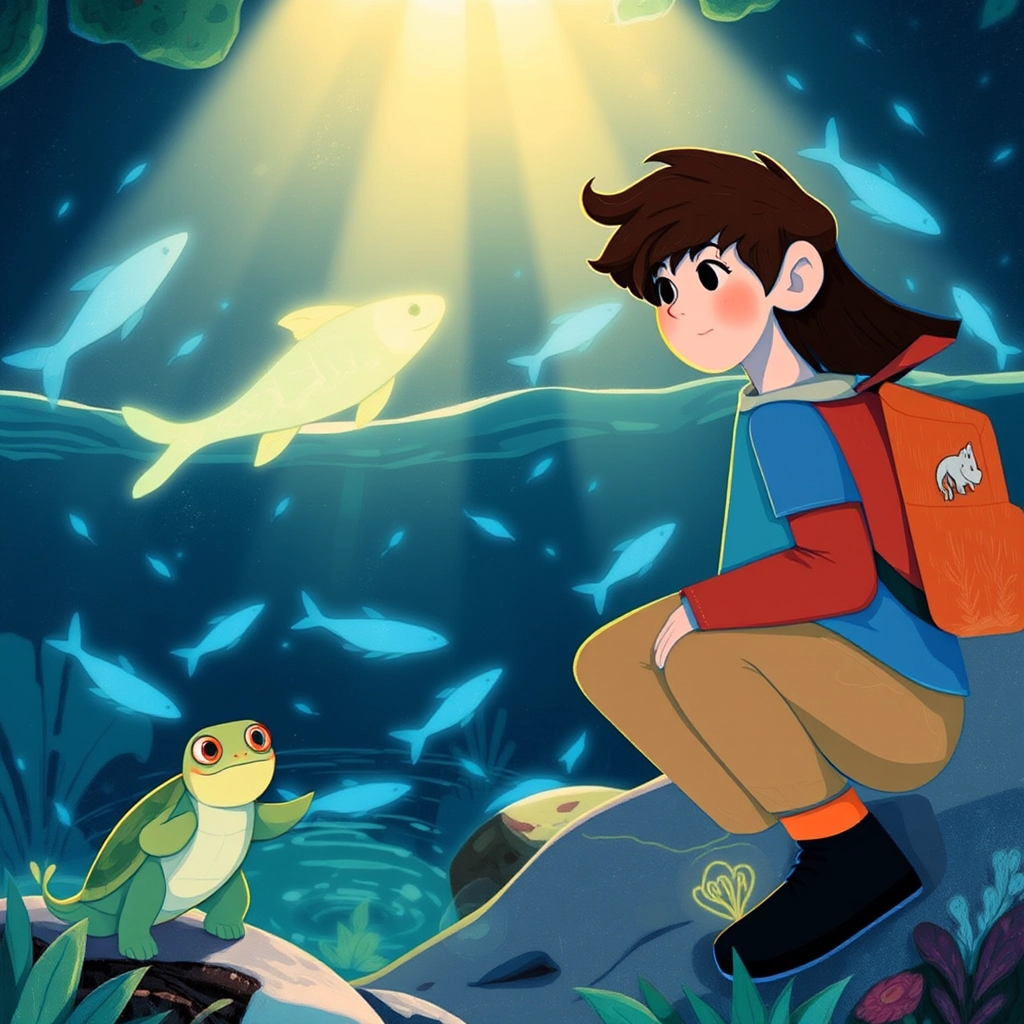 Next, they discovered a crystal-clear pond where glowing blue fish leapt out, creating rainbows in the air. 'These fish paint the skies each evening!' said a cheerful turtle wearing golden spectacles.
