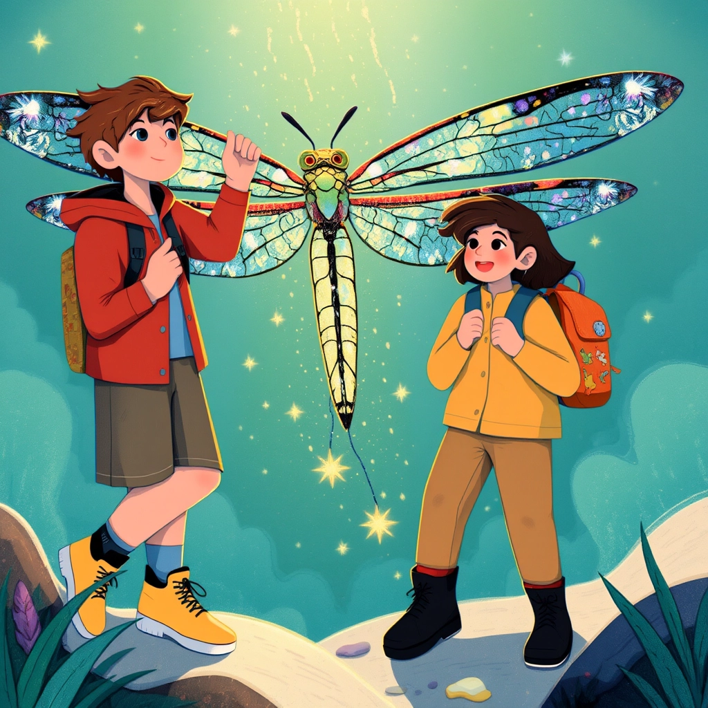 The first thing they saw was a giant dragonfly with wings that shimmered like stained glass. It twirled gracefully in the air, then spoke, 'Welcome to the Magical Zoo! Today, you will unlock wonders beyond your imagination.'