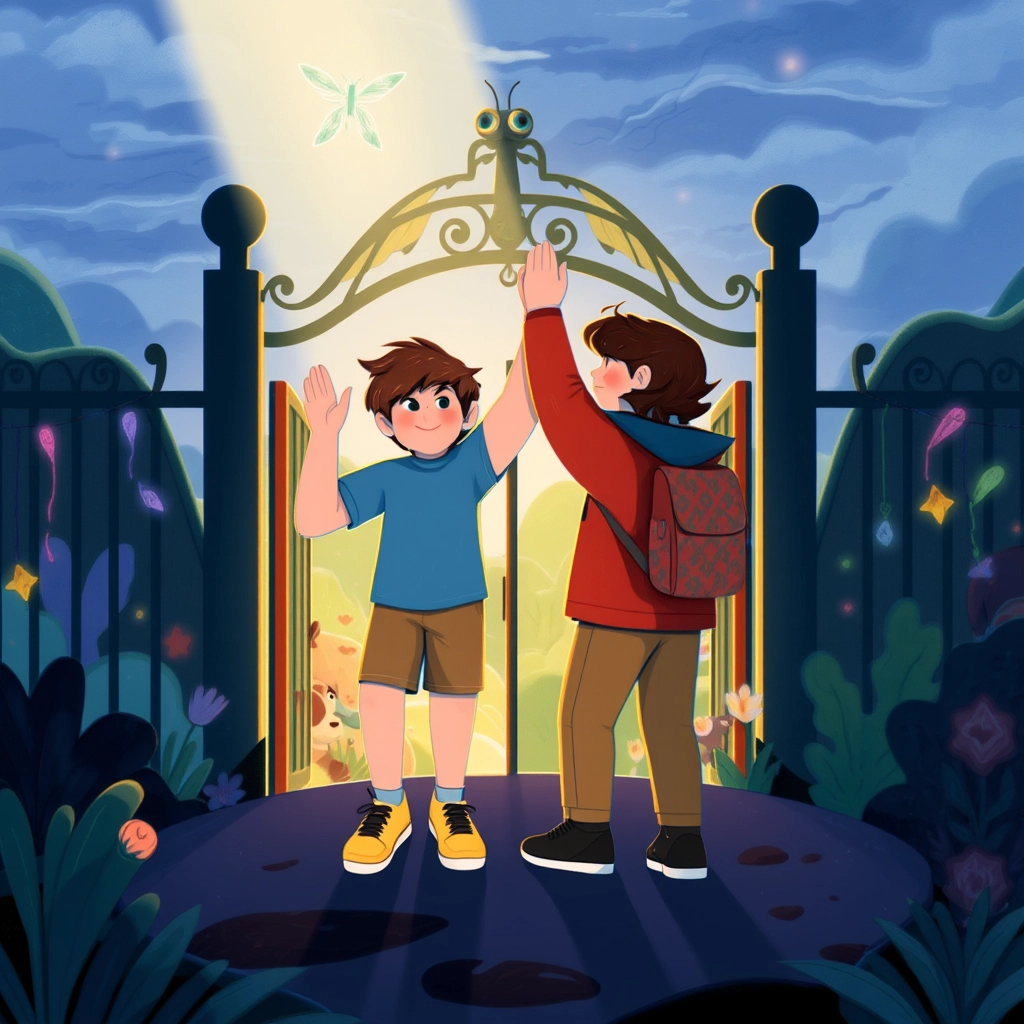 At last, the dragonfly guided them back to the gate. 'Your imagination has made this adventure special. Return anytime—our zoo is always waiting!' it said before fluttering away.