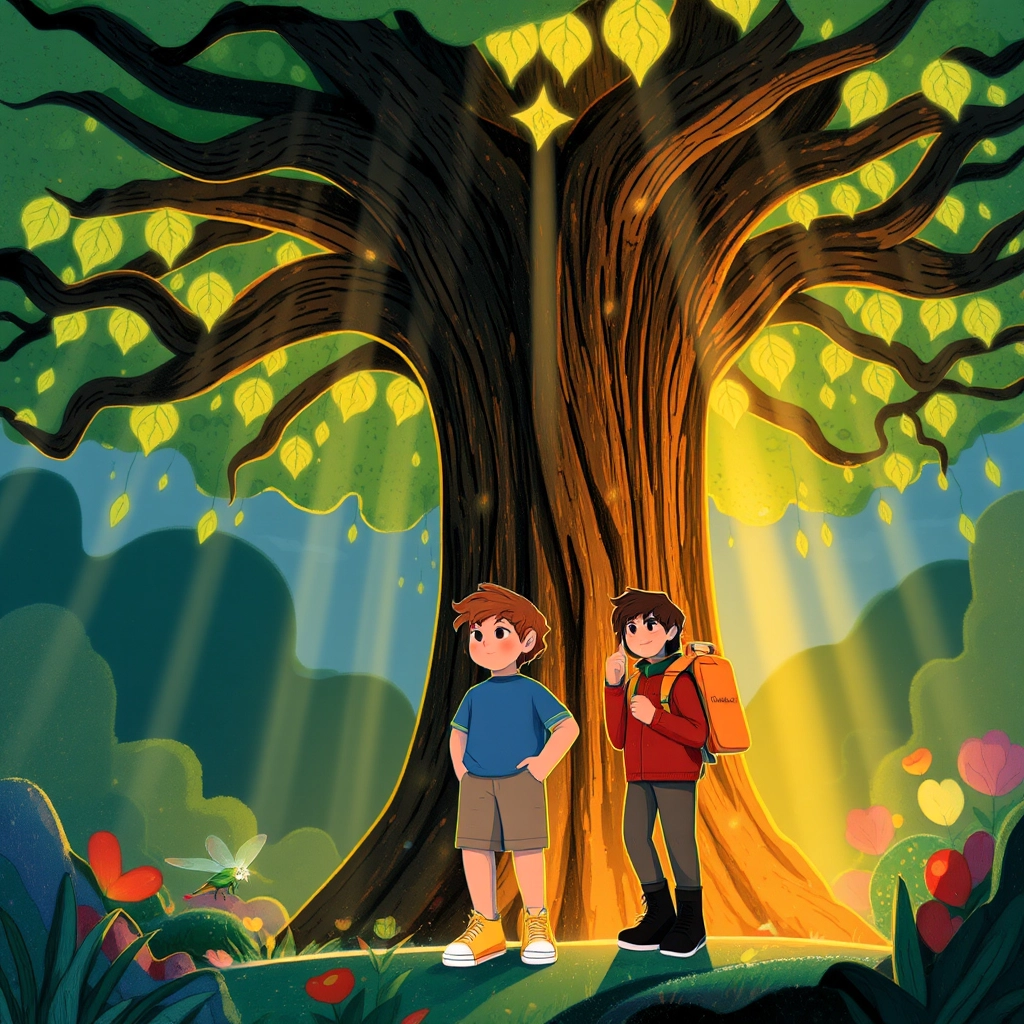 Their journey led them to the heart of the zoo, where a towering tree with golden leaves shone brilliantly. 'This is the Tree of Imagination,' murmured the dragonfly. 'It keeps our zoo thriving with wonder.'