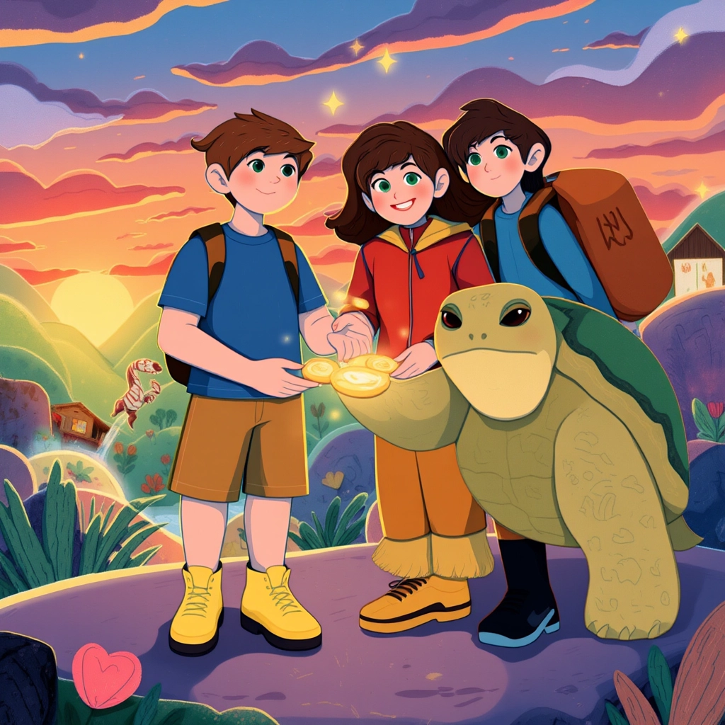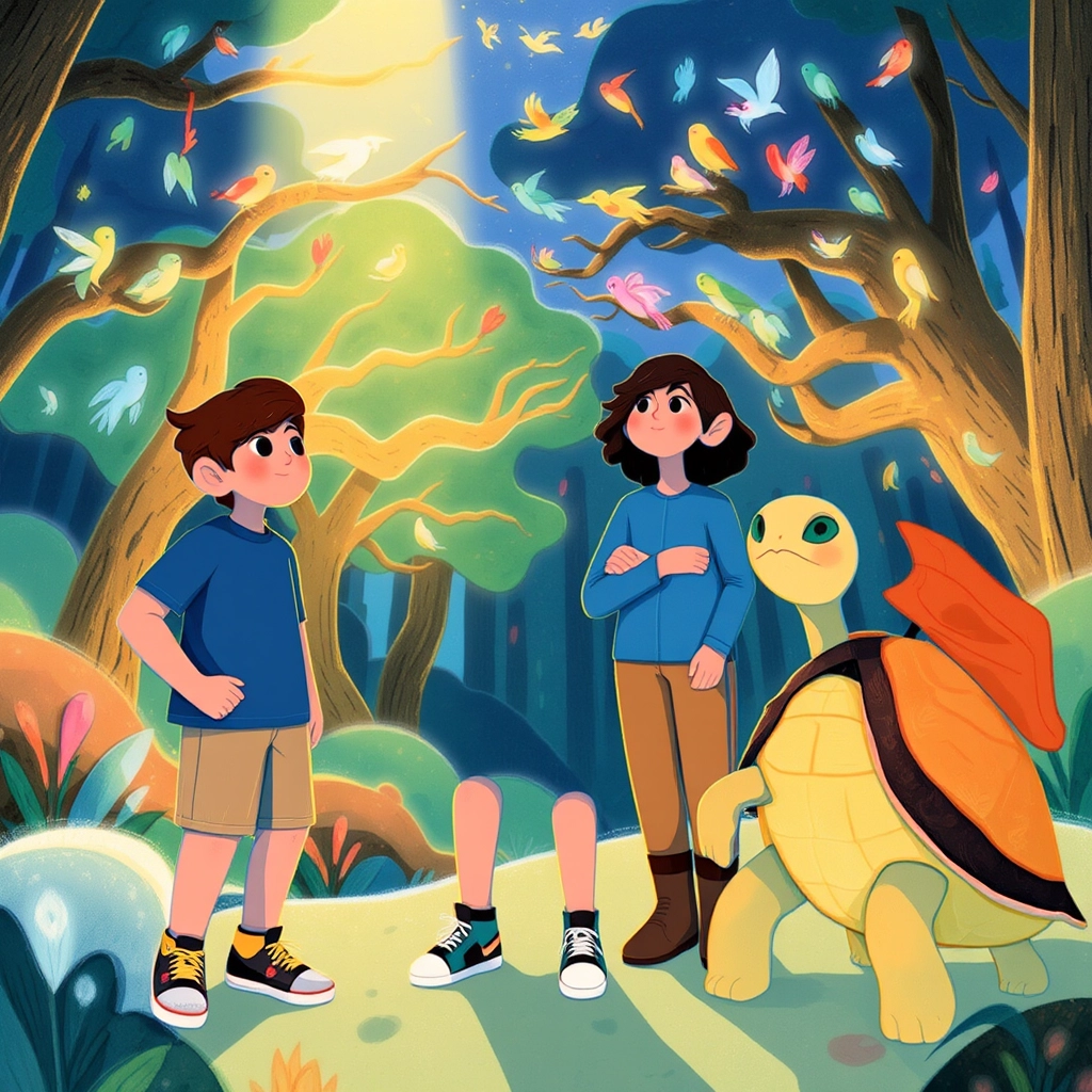 As [Ben](TW5Z2WK4) and [Emory](BQTW9327) explored, they met [Kai](KPVMXNTR), a giant turtle with a golden shell and wise green eyes, who offered to guide them. 'Welcome to the Enchanted Zoo,' he said. 'Every animal here has a story. Would you like to hear one?'