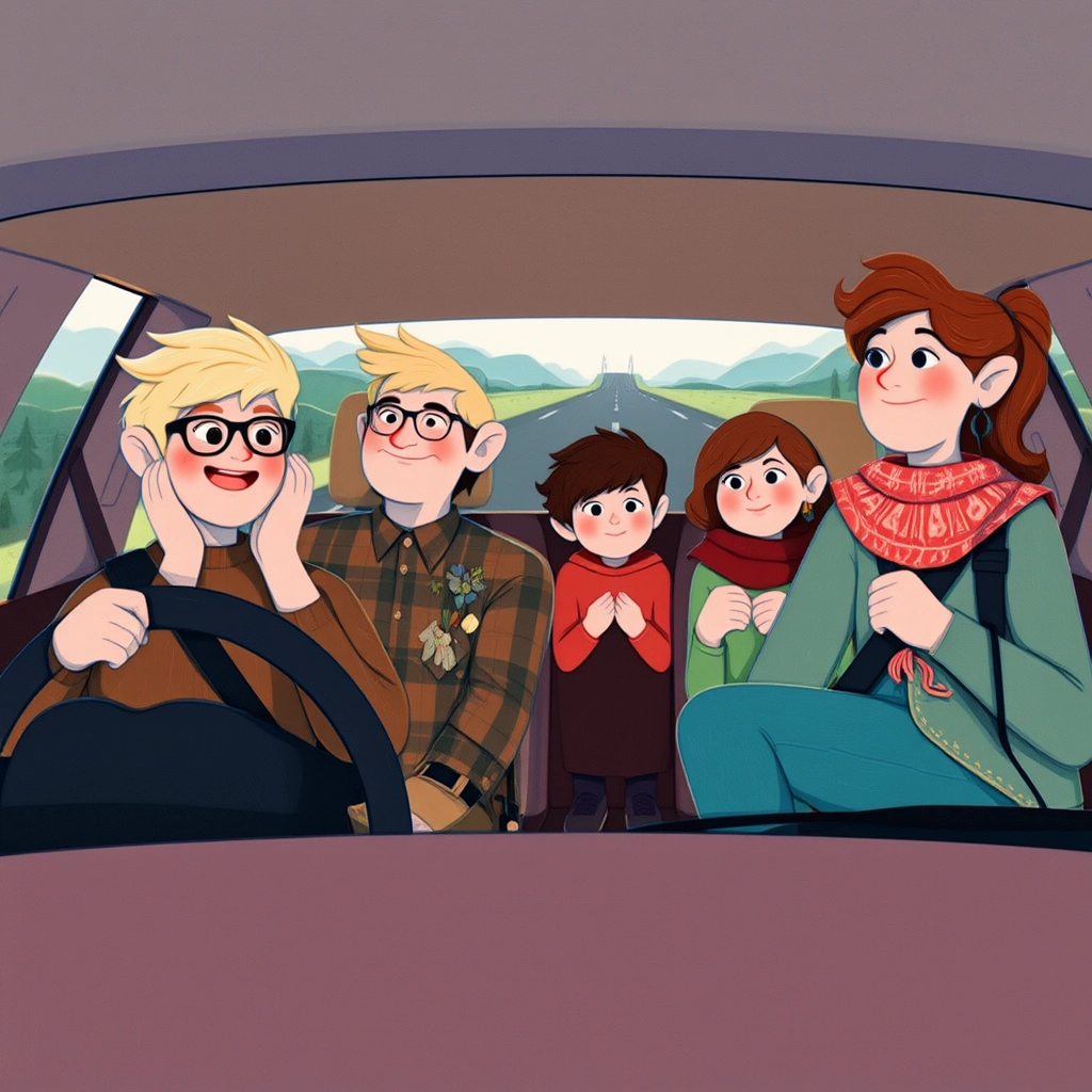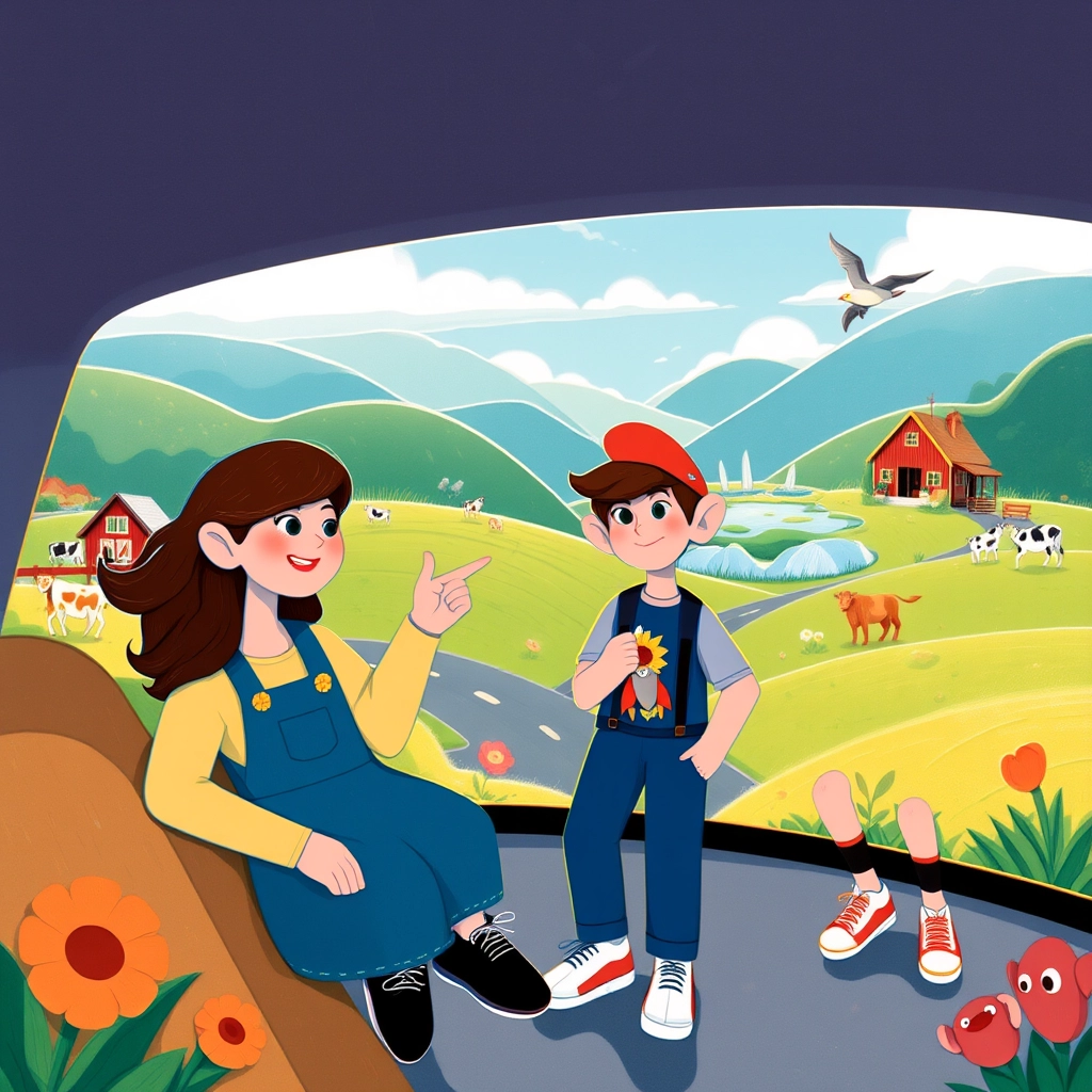 As they waved goodbye to their neighbors and headed onto the winding country roads, [Mia](4LV5JMNG) excitedly pointed out cows grazing by a red barn, and [Max](PKZRRCJ5) spotted a flock of birds flying over a clear blue lake.