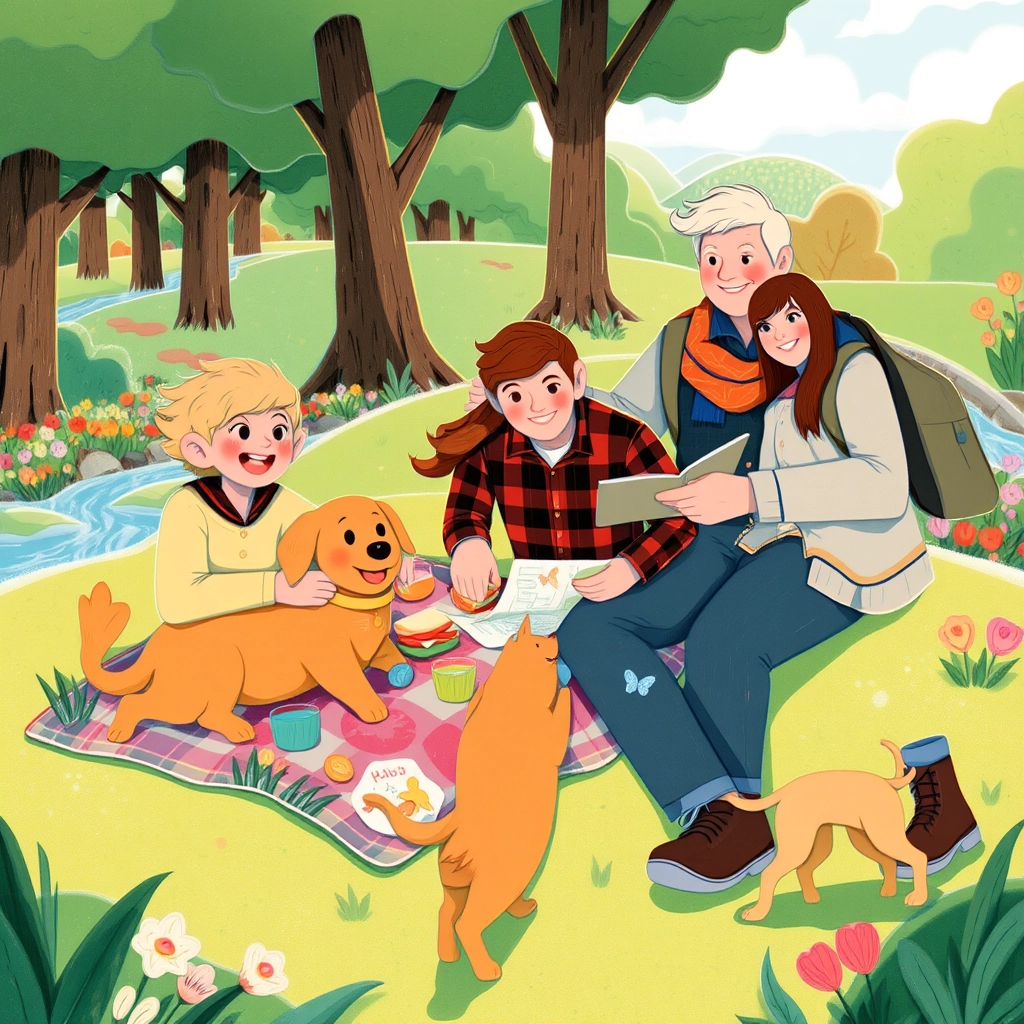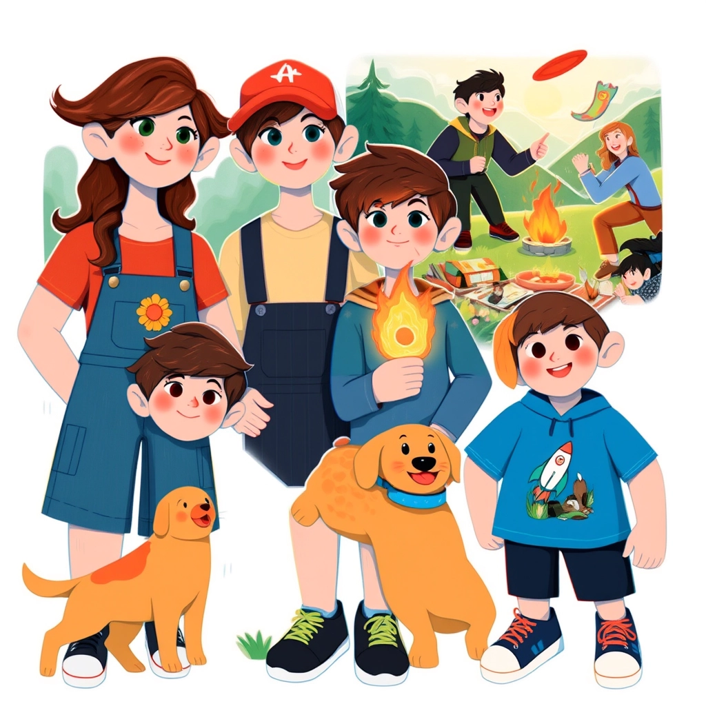 It was an exciting morning as the Sunshine family—the cheerful bunch of [Dad](DG7JJHX5), [Mom](D4H7KXC3), twins [Mia](4LV5JMNG) and [Max](PKZRRCJ5), and their dog [Buddy](4NYBL6JN)—loaded their bright yellow station wagon for a week-long road trip.