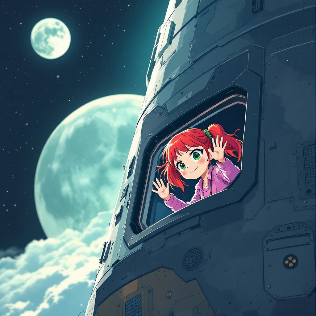 After a fun day exploring and collecting moon treasures, it was time to return. As the rocket lifted off, [Sarah](B5TBVJ7W) waved goodbye to the big, bright moon. “See you again soon!” she called.