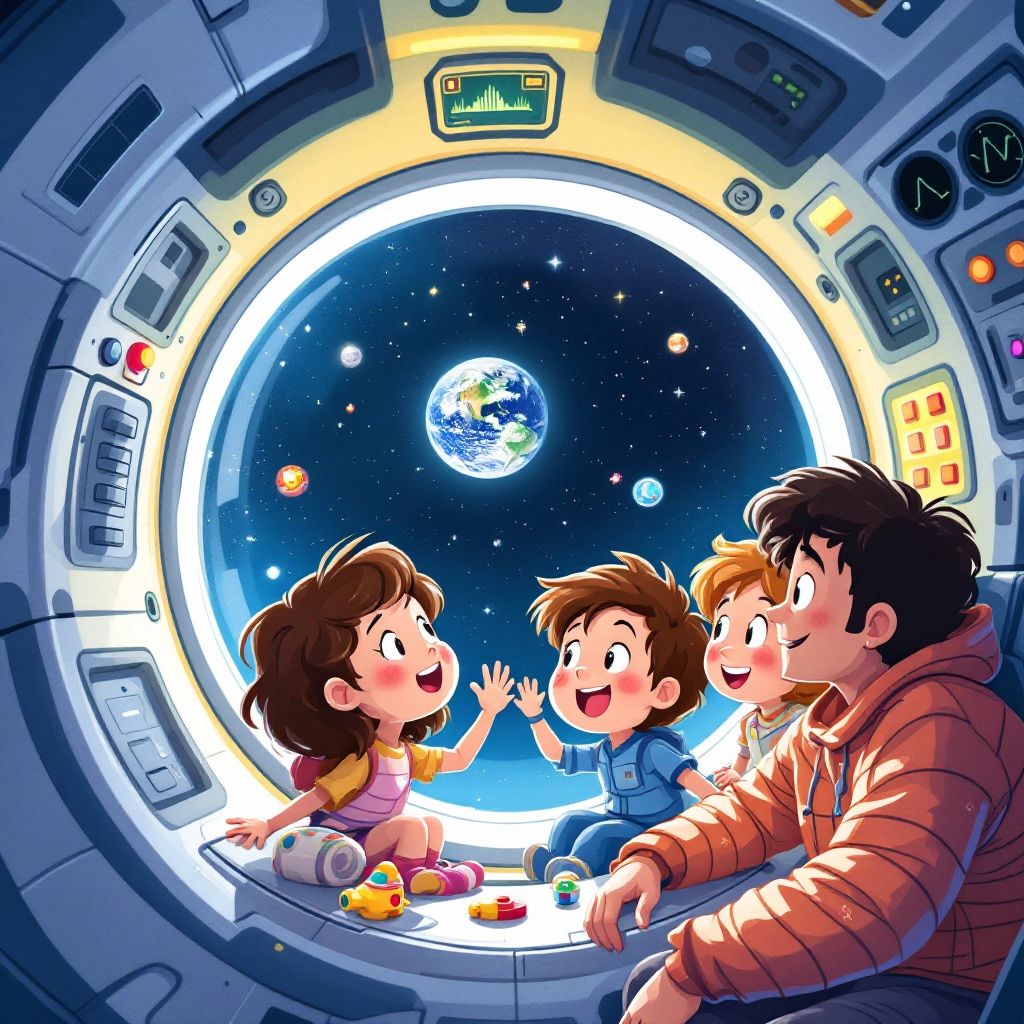 As the rocket blasted off, the friends could feel the rumble beneath them. Through the window, they watched as the city they knew and loved grew smaller and smaller. Soon, they were floating in space, Earth a blue marble below.