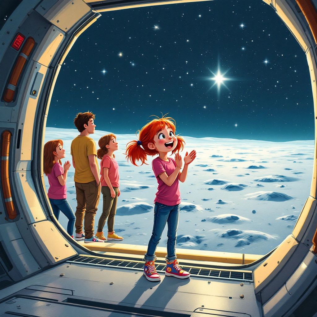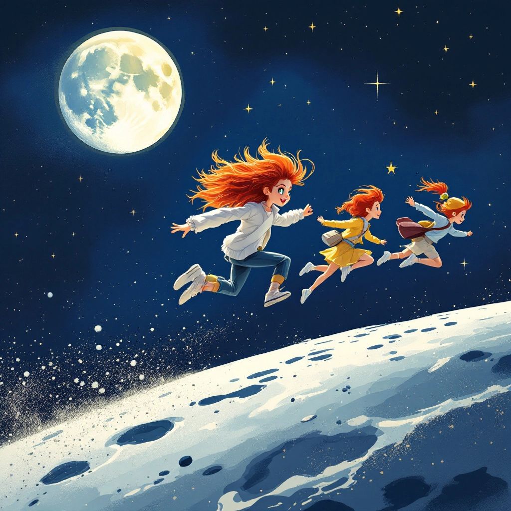 They hopped out, feeling lighter than air. “Whee!” said [Liv](FBV47M6F), jumping higher and higher. Her red hair floated around her like fire in space as they all bounded across the moon's surface, leaving happy footprints in the dust.