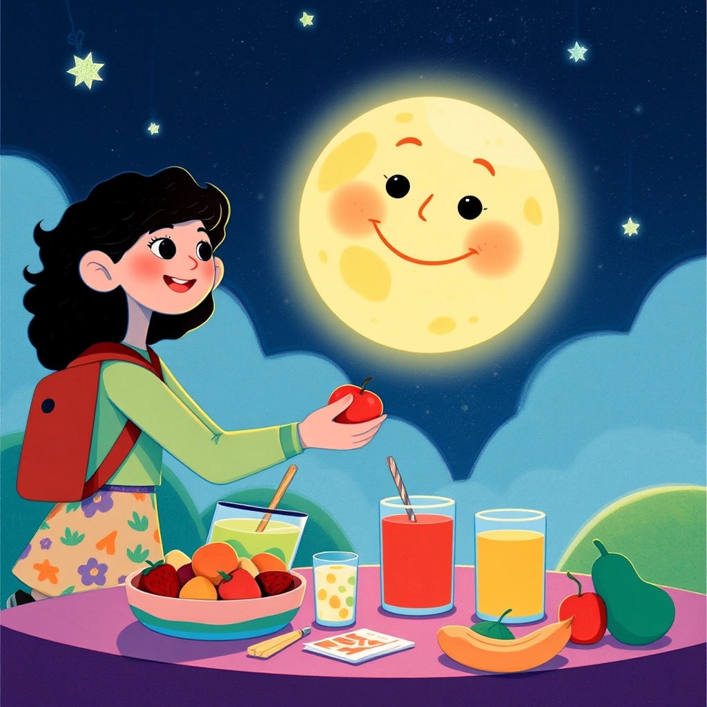 When it was snack time, the Moon wanted to try an apple, but it just rolled off its light!