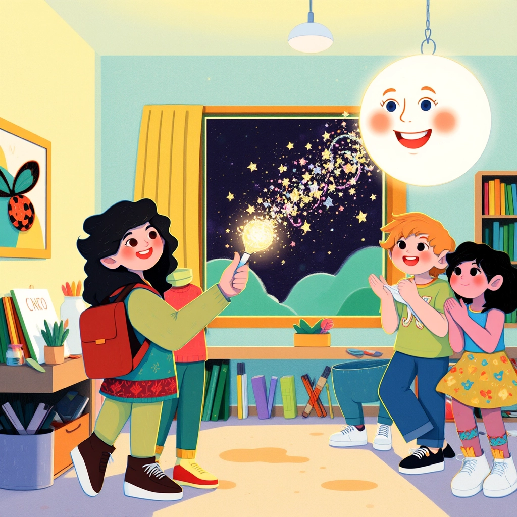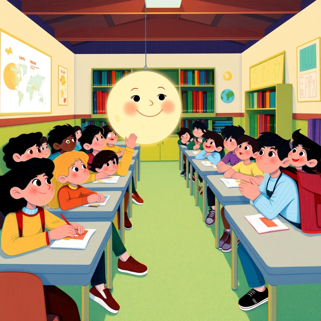 In art class, the Moon painted the stars and planets. The other kids loved its sparkly picture!