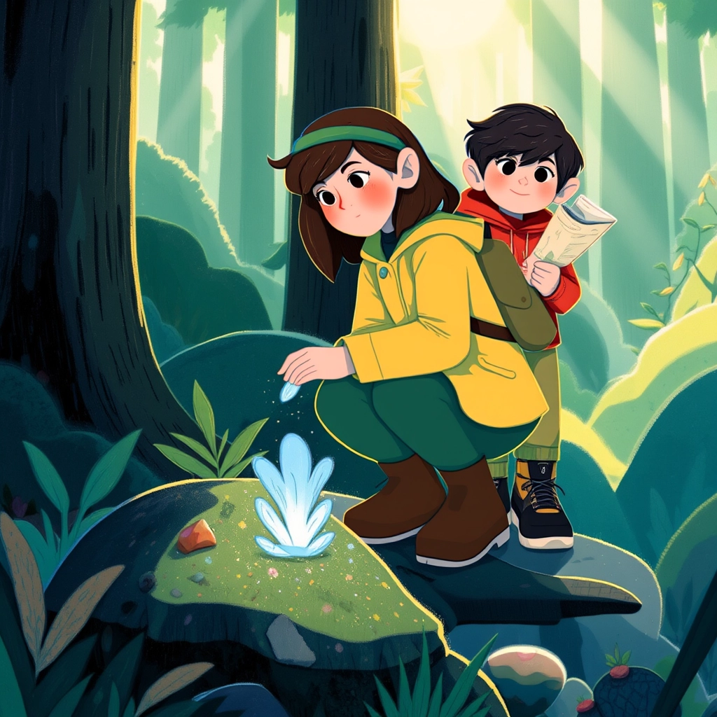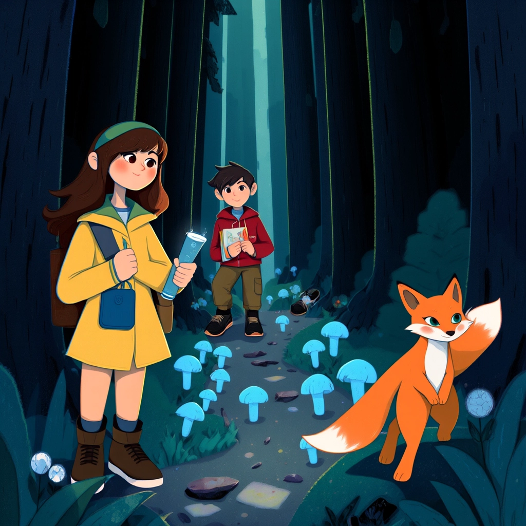 [Lena](7C3BYMLR) and [Kai](3KGGMTVV) loved exploring the woods after school, dreaming of pirate treasure and hidden kingdoms. But today, an enchanting blue glow caught their eyes deeper in the woods. 'What is that?' [Lena](7C3BYMLR) whispered, her brown eyes wide with curiosity.