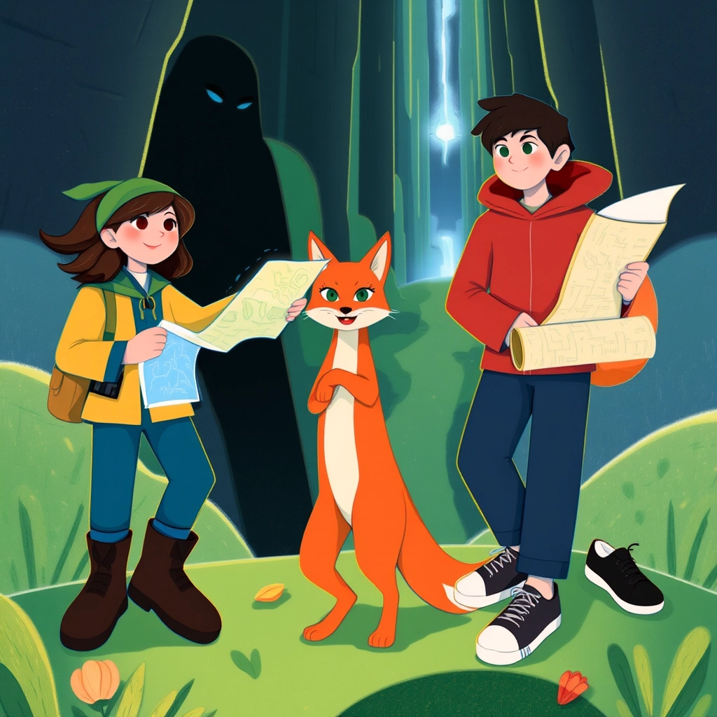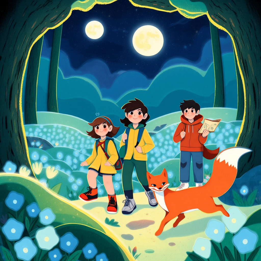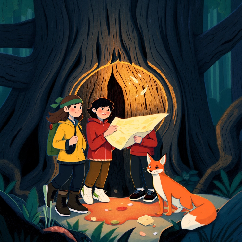 The fox led them to an ancient tree with a hidden hollow. Inside was an old, creased map marked with glowing blue dots. 'This will guide you,' the fox said. 'Hurry—the moon is already rising.'