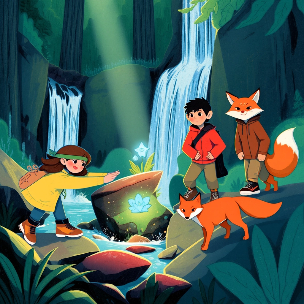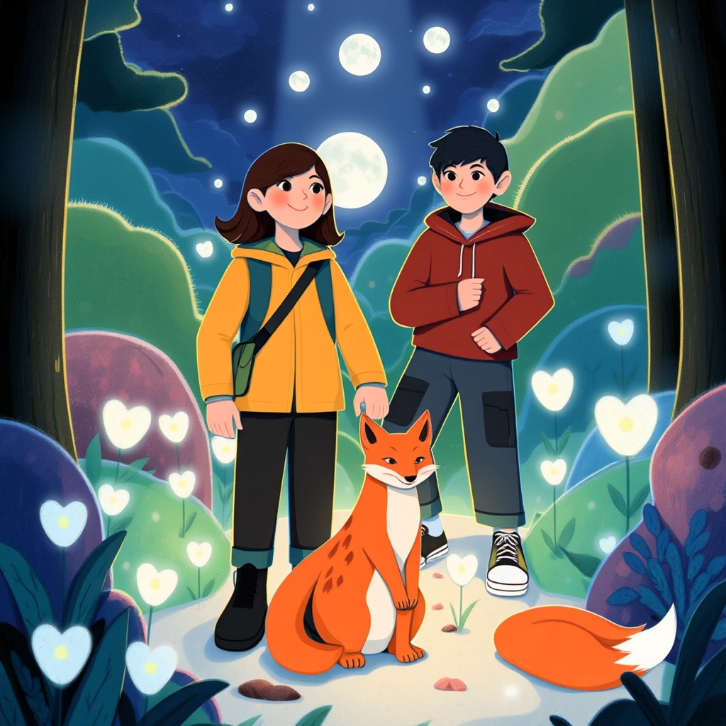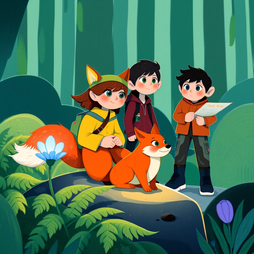 The fox led them to an ancient tree with a hidden hollow. Inside was an old, creased map marked with glowing blue dots. 'This will guide you,' the fox said. 'Hurry—the moon is already rising.'