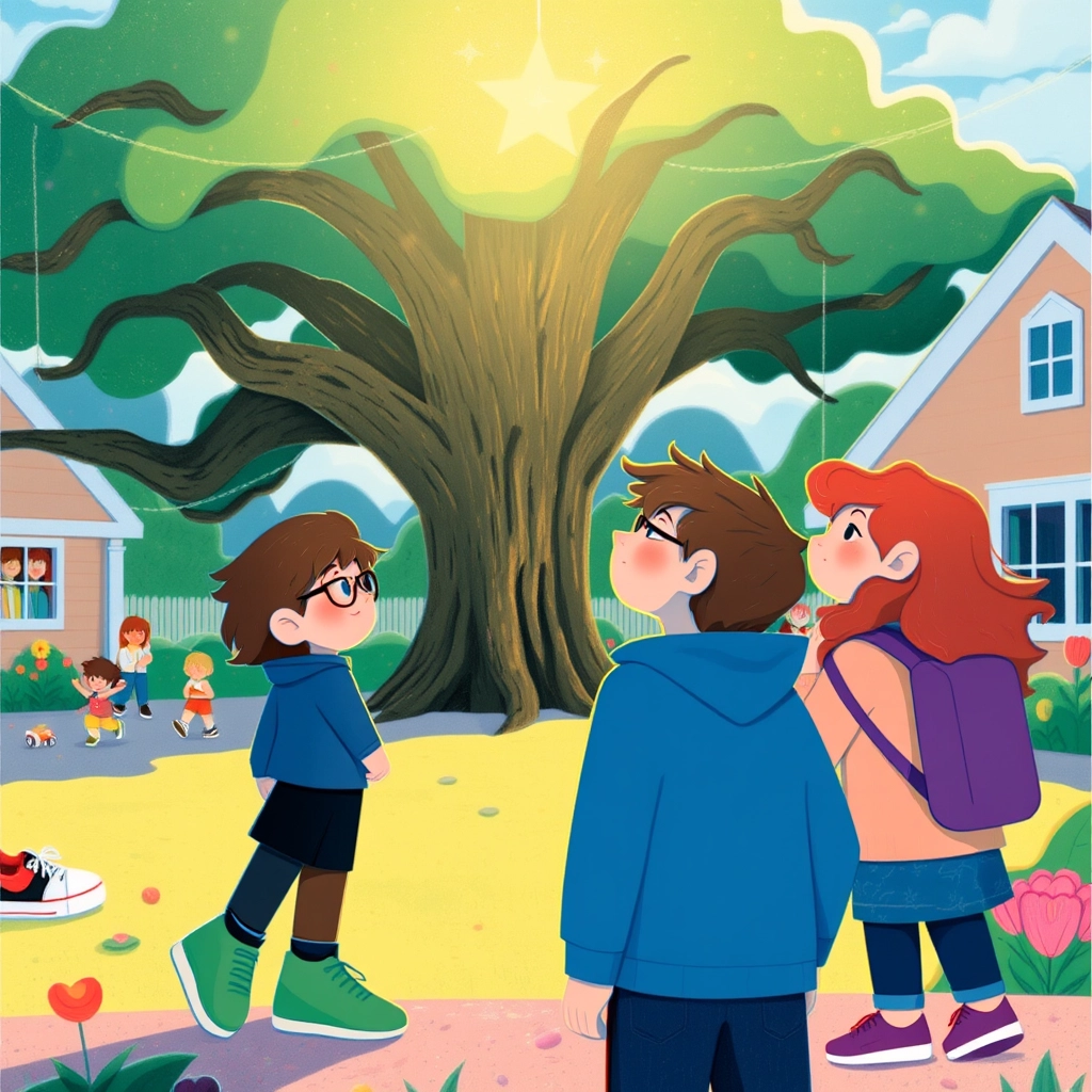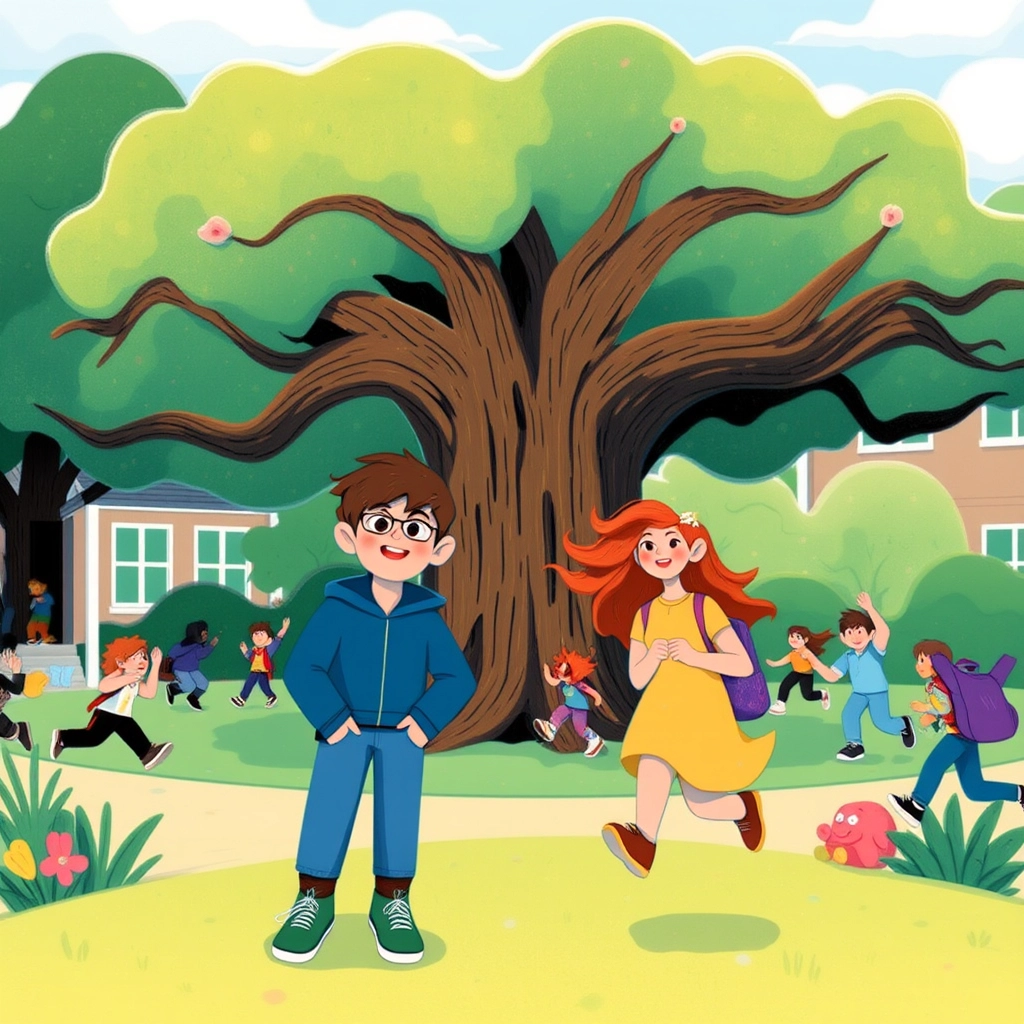One bright spring morning, [Max](JDZCQ9MS) and [Lily](QJ6JFPYX), two best friends in Year Five, sprinted across their bustling schoolyard. [Max](JDZCQ9MS) adjusted his glasses as they stopped by the school’s massive oak tree, which stood like a guardian, watching over the playground.