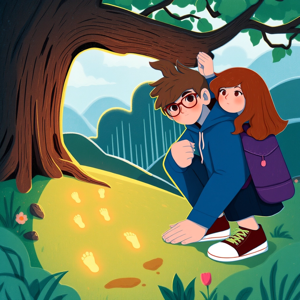 [Max](JDZCQ9MS) and [Lily](QJ6JFPYX) decided to follow the trail, stepping past blooming wildflowers and whispering trees. The glowing footprints seemed to dance ahead of them, leading them into the heart of the woods.