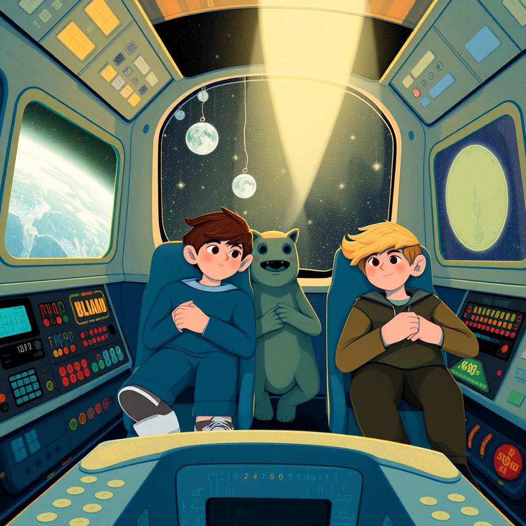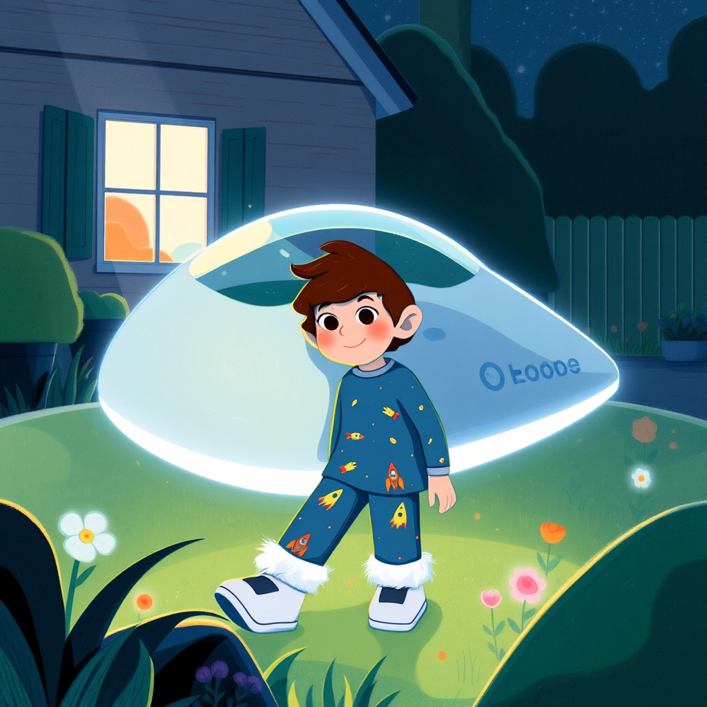 Out in the garden, a spaceship had landed! It was shiny, round, and had glowing blue lights that shimmered like water. 'Let’s check it out!' [Matthew](SYTKDVP7) said, pulling on his slippers. The boys hurried outside.