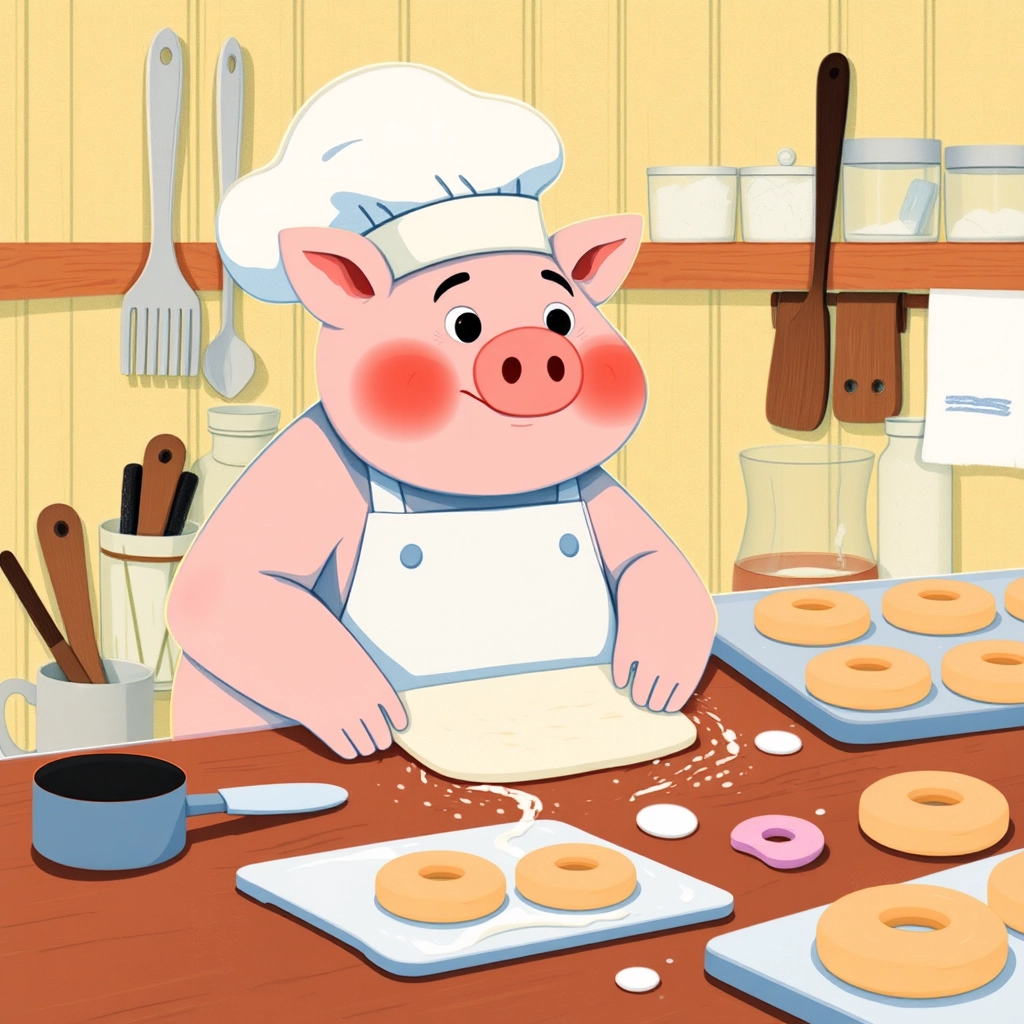 [Papa Piggle](7TBXG59C) loved to bake. Early every morning, he rolled out the dough with his big, strong hooves and made perfect donut rings.