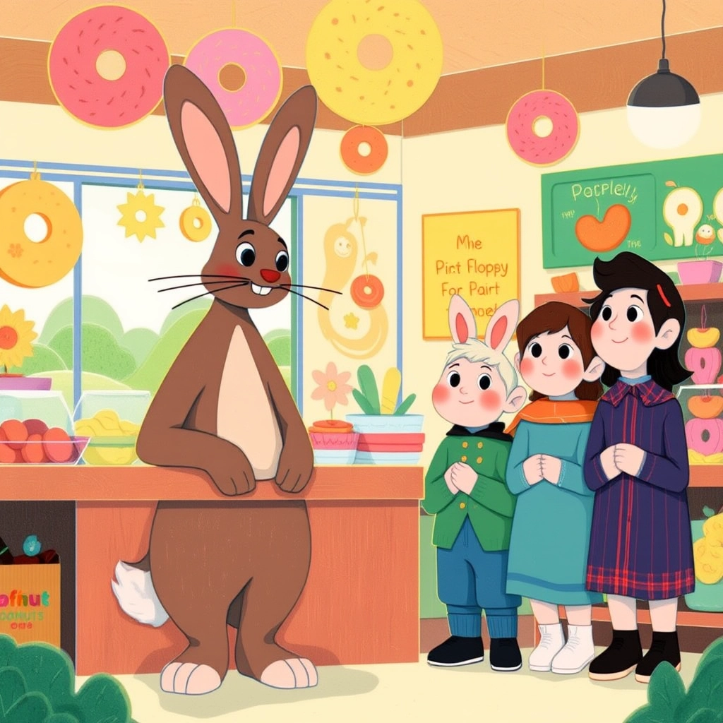 One day, a rabbit named [Mr. Flopsy](4VTWZND5) came in. He asked, 'Do you have carrot cake donuts?' The Piggles had never thought about making them before.
