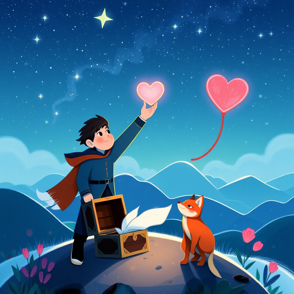 At the top of the mountain, Nico found a small treasure chest surrounded by stars. He opened it to discover a glowing heart-shaped crystal that pulsed with warmth.