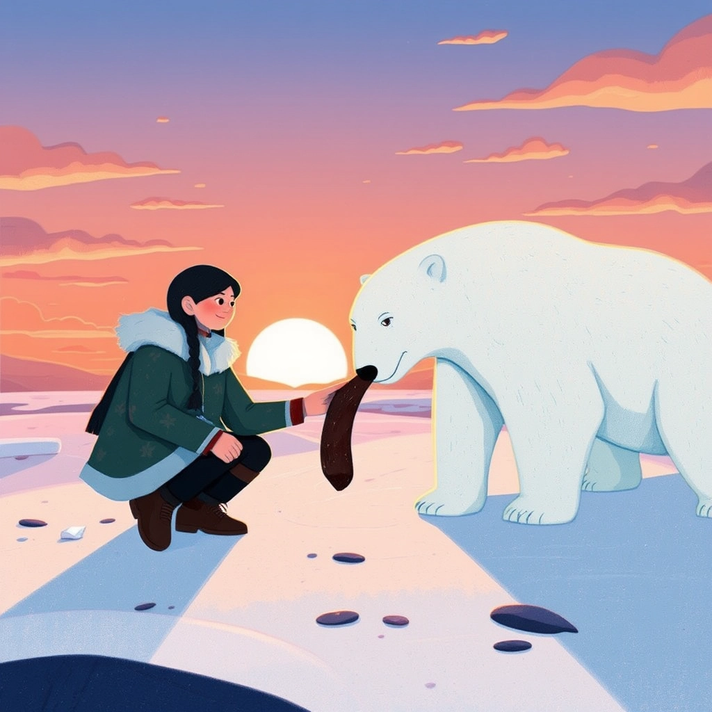 Together, [Anori](2GP67K6L) and the polar bear traveled farther than ever, meeting seals, arctic foxes, and even shy narwhals. She understood animals like never before and became a storyteller to her people.