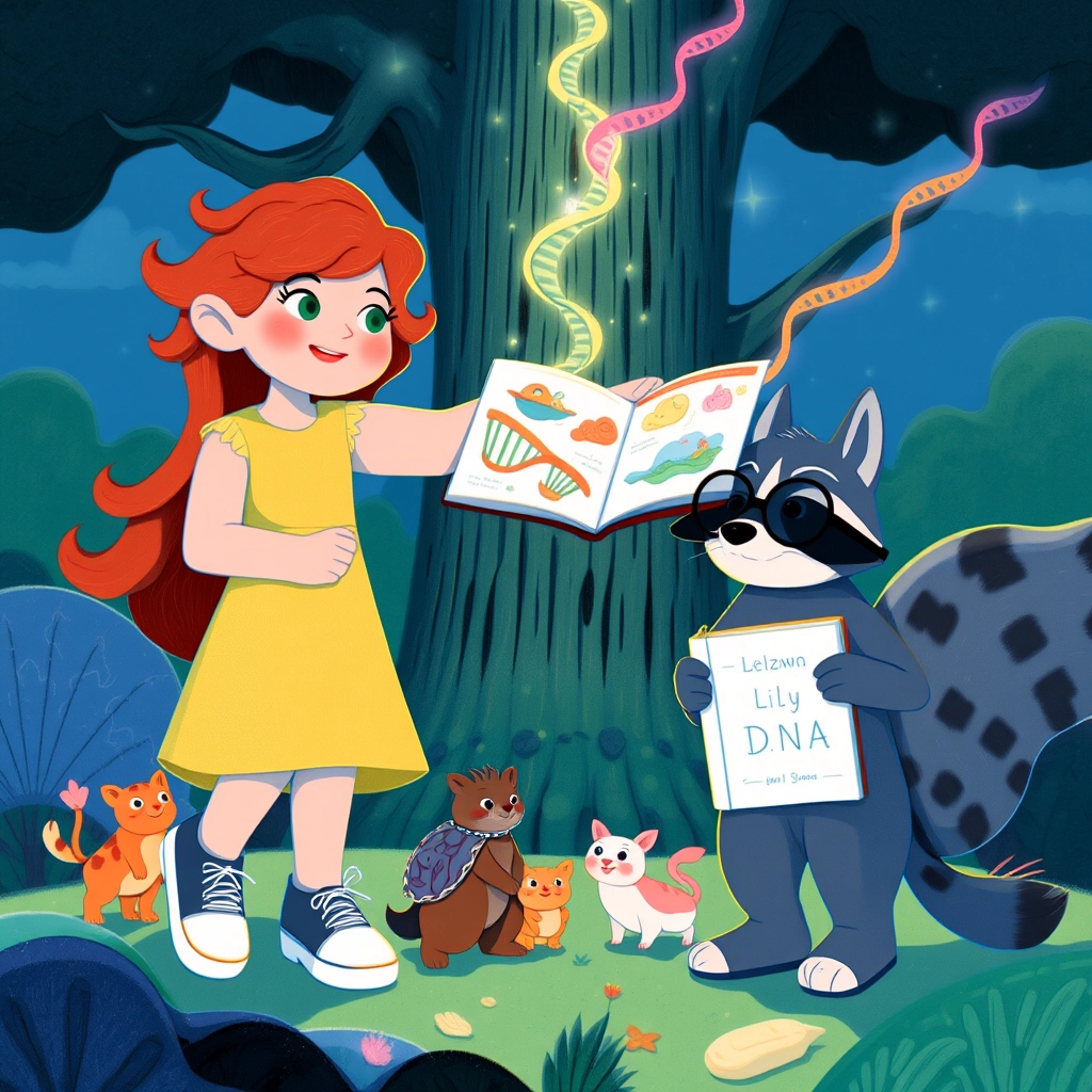 'What's DNA?' [Lily](65KMGYKW) asked eagerly. [Gizmo](YJDKGJG9) chuckled. 'DNA is how all living things are made! It's the special code that makes you unique, like your red curls or my fluffy tail!'