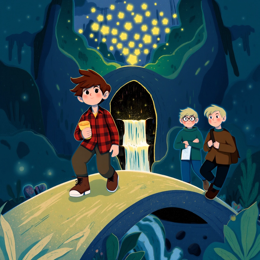 Down the path, they came to a sparkling stone bridge. As they crossed, a group of fireflies formed the shape of an arrow, pointing toward a hidden cave that glittered like diamonds.
