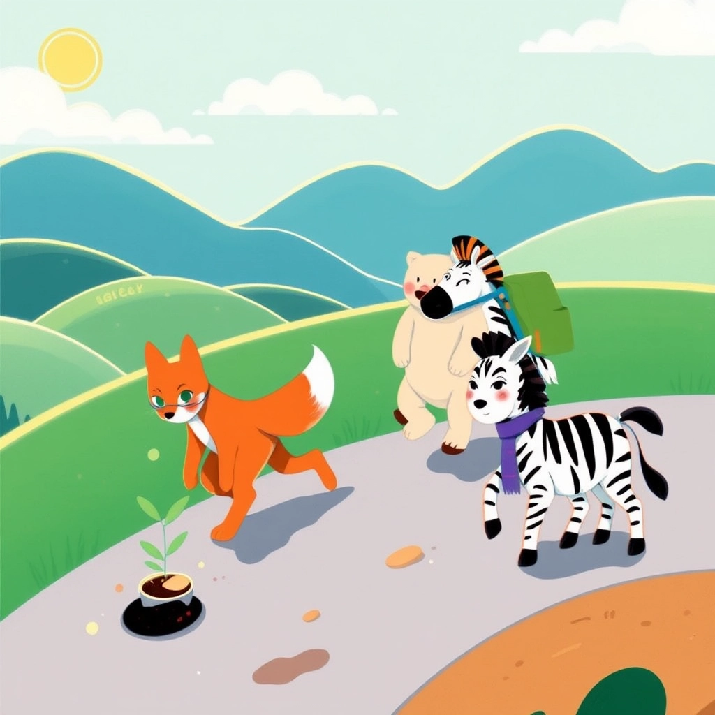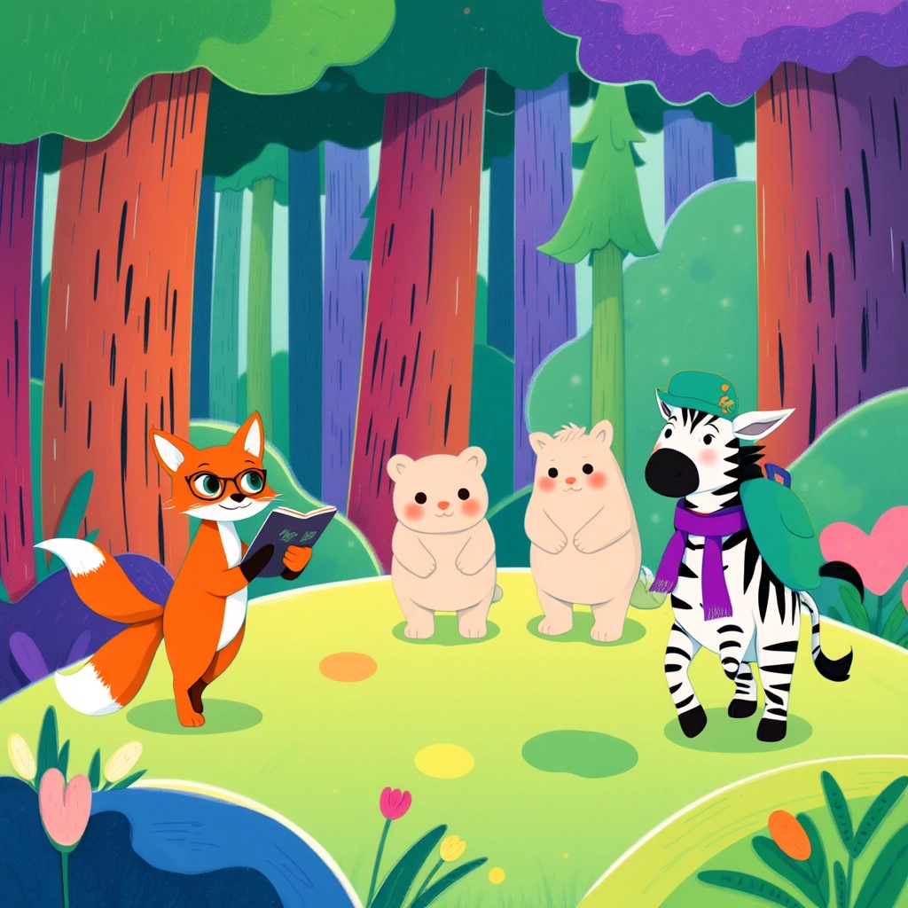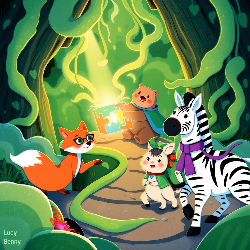 Once upon a time, in a magical forest where all the trees shimmered in rainbow colors, there lived three best friends: [Lucy](JH3GY3Q3) the clever fox, [Benny](5ZVYJ2P2) the shy bear, and [Zara](BBKVFSGD) the adventurous zebra.