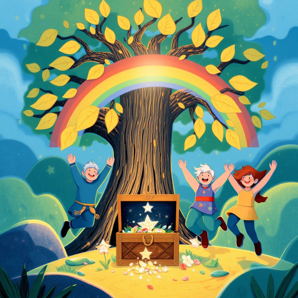 With courage, teamwork, and the treasures they collected, they reached the X: a golden treasure chest beneath the Rainbow Tree.