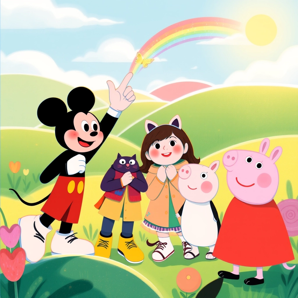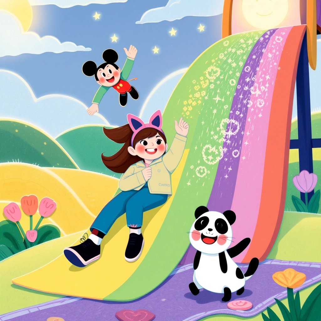 One by one they slid down—WHEEEE! Peppa snorted with laughter, [Gaby](3QQKV2KD) held Pandy tight, and Mickey spun in happy circles. At the bottom, they landed softly back in the meadow, ending with cupcakes, pie, and giggles. What a perfect day!