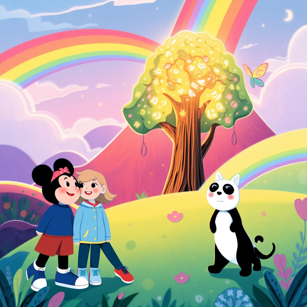 Finally, they reached a glowing hill with a tall, beautiful rainbow tree shining at the top. “That’s it! My home!” the butterfly cheered.