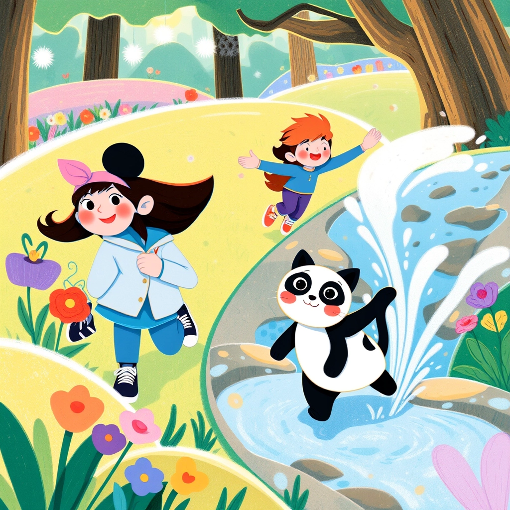 The friends walked through sparkly grass, past giggly flowers that tickled Pandy’s paws. They crossed a tiny stream where Peppa splash-splash-splashed, making everyone laugh.
