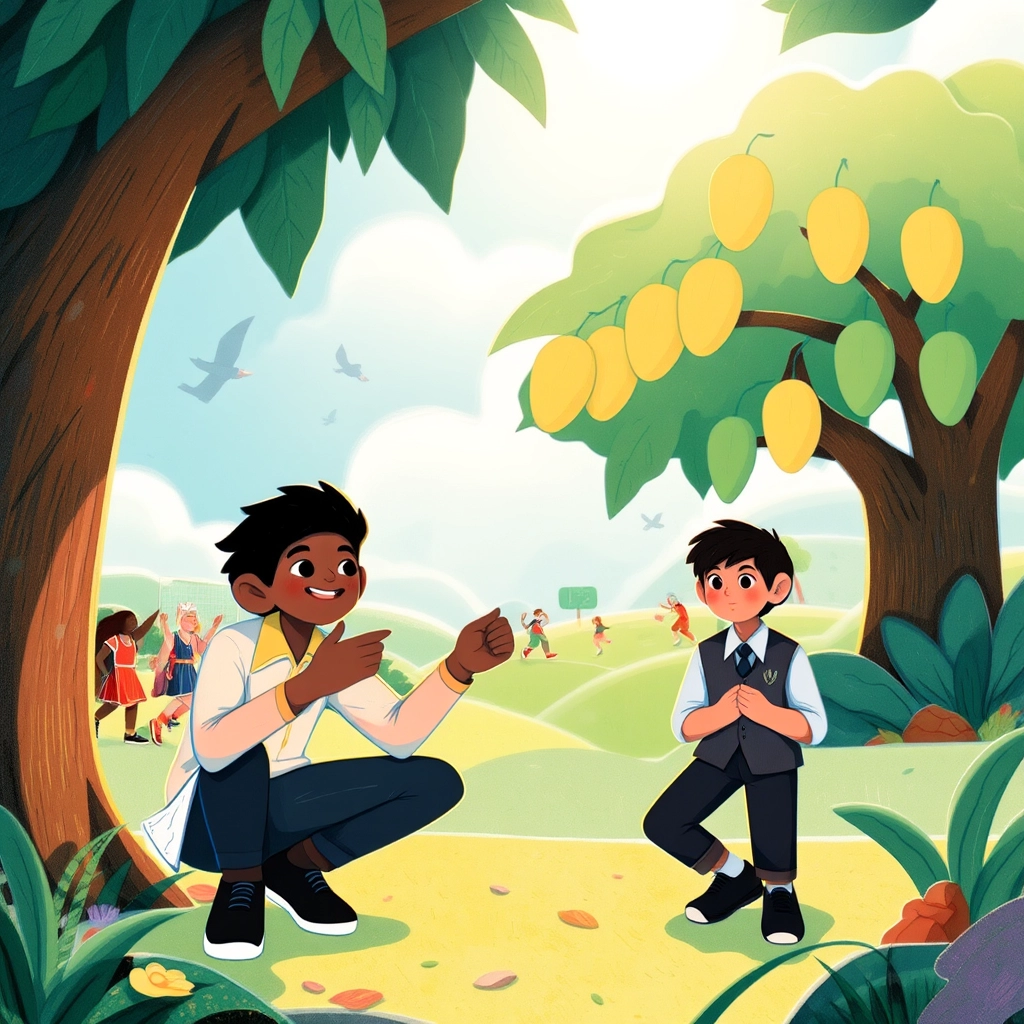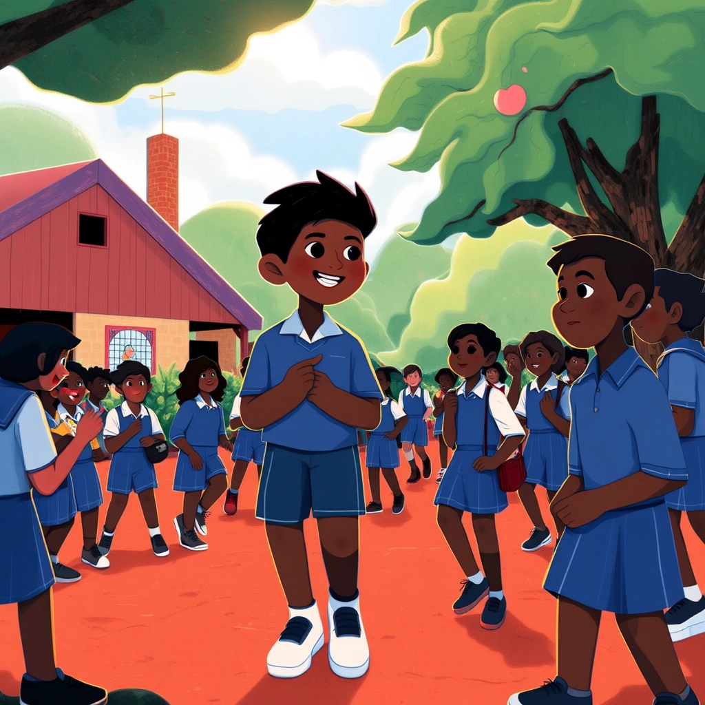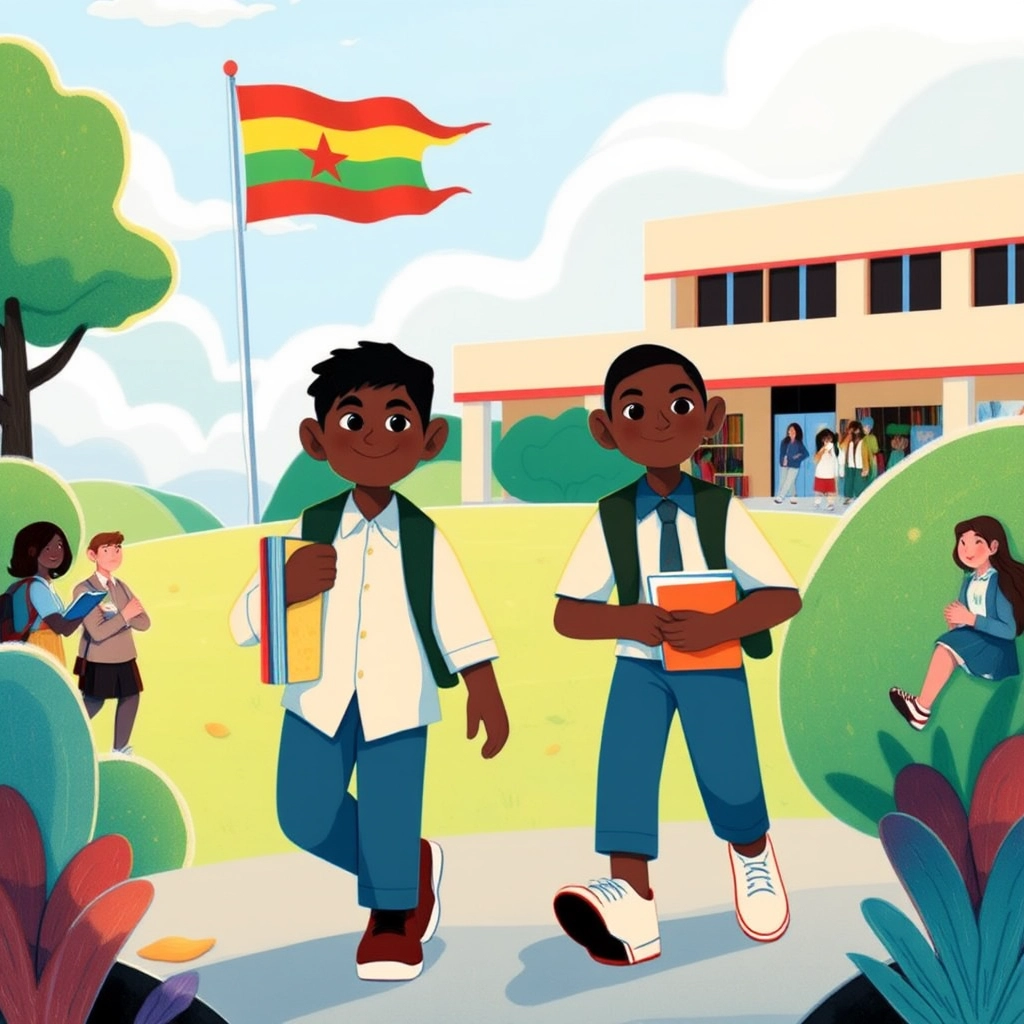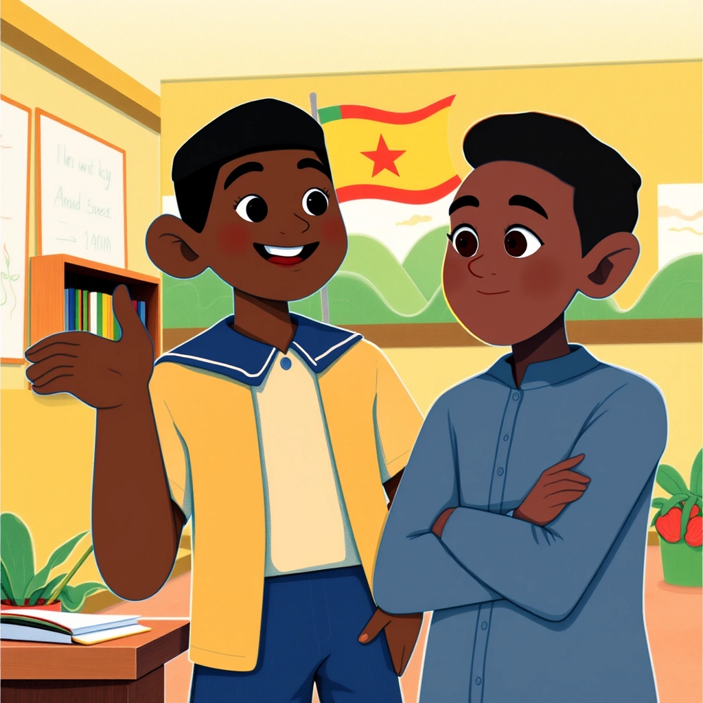 [Kobina](SXHGMTQK), a mischievous boy with black hair and brown skin, strolled into the dusty St. Andrews Junior High School yard. His carefree smile, however, hid his reckless nature. "[Amu](3LNT4FWH)!" he called out, spotting his shy and hesitant friend near the tamarind tree.