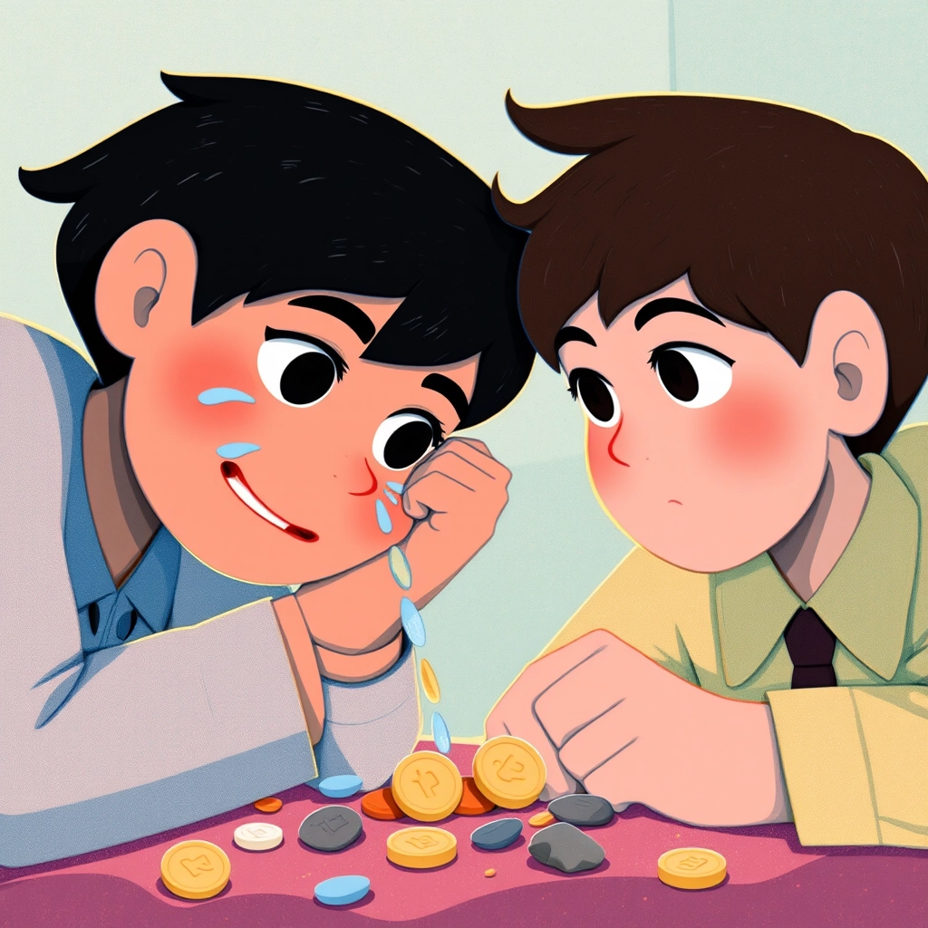 By the end of the game, the money was gone. [Amu](3LNT4FWH) felt tears gather in his eyes. "What will I tell my mother?" he whispered. [Kobina](SXHGMTQK) frowned, realizing they were in serious trouble.