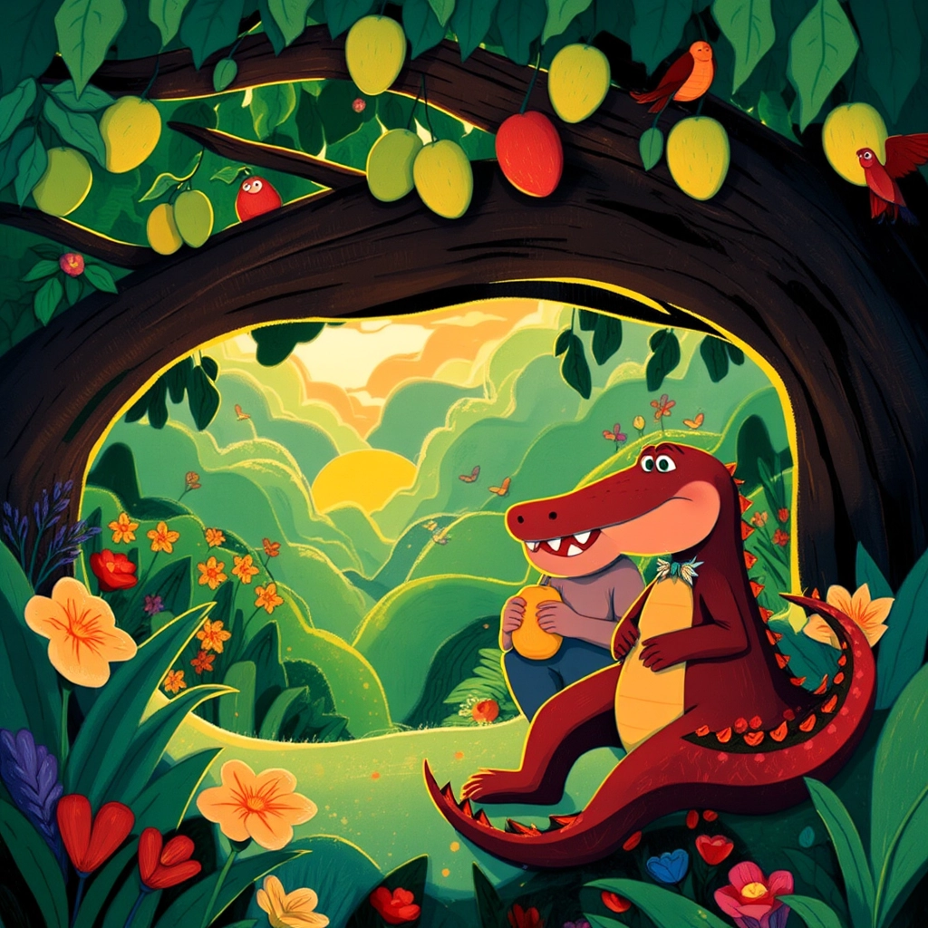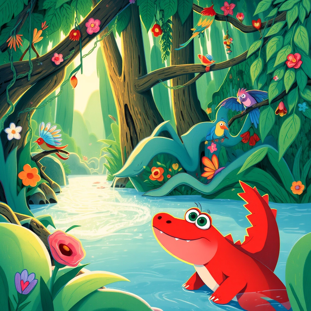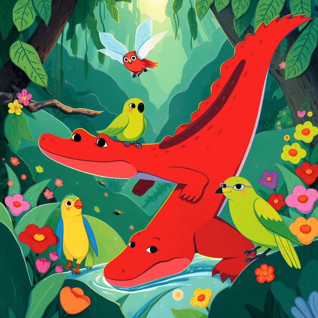 In the heart of a vast, green jungle, there lived a very unusual crocodile named [Crimson](25MJV6VP). [Crimson](25MJV6VP) wasn't like other crocodiles—he was bright red like a ripe tomato and loved to explore!