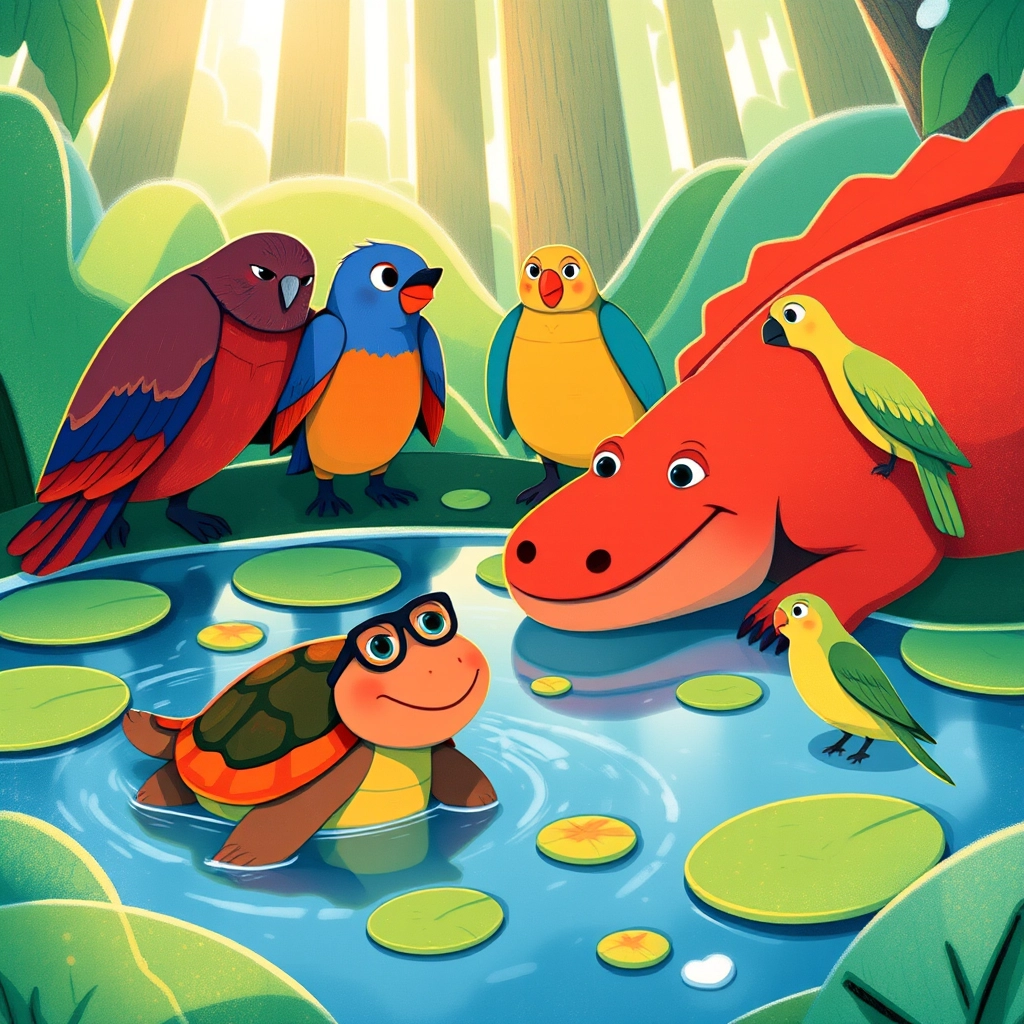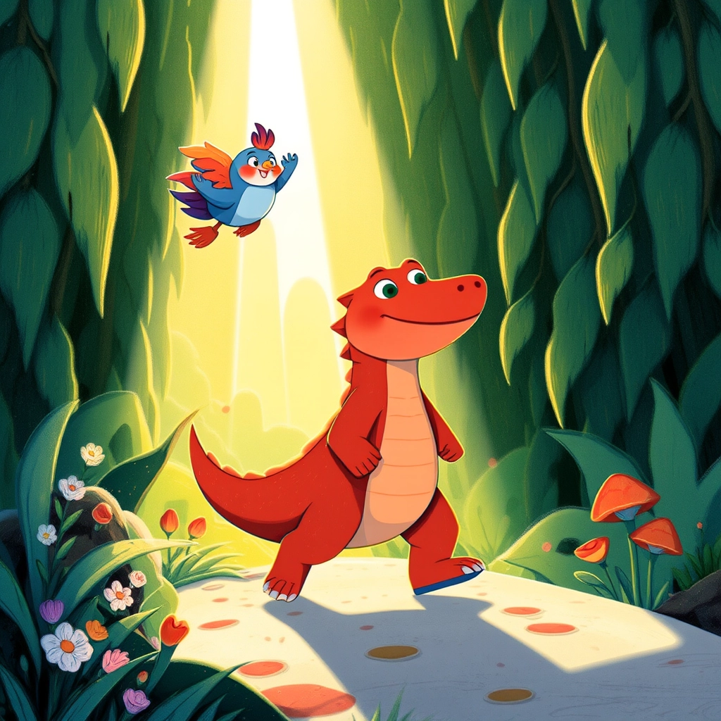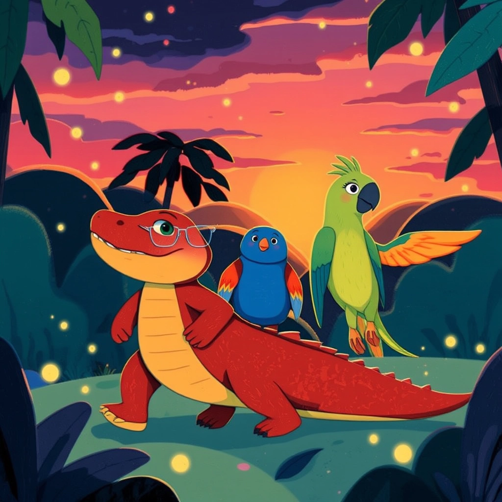 In the heart of a vast, green jungle, there lived a very unusual crocodile named [Crimson](25MJV6VP). [Crimson](25MJV6VP) wasn't like other crocodiles—he was bright red like a ripe tomato and loved to explore!