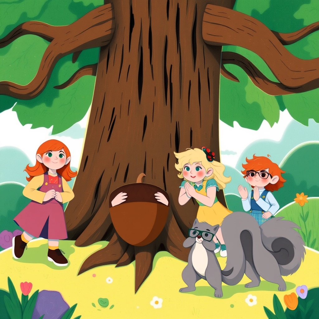 One day, while playing in the meadow, they met [Mr. Bumble](4XKHK9GW), a friendly, round squirrel who was struggling to carry a big acorn to his tree.
