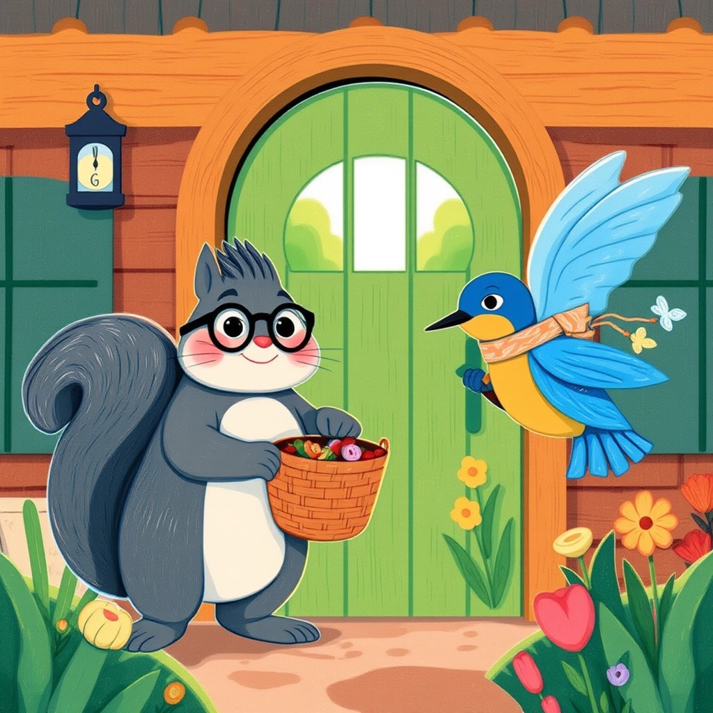 Suddenly, they heard a knock at the door. It was [Mr. Bumble](4XKHK9GW), holding a basket of nuts, and the bluebird, carrying a tiny bouquet of flowers!