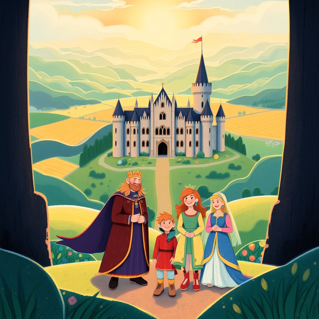 Once upon a time, nestled in a kingdom of rolling emerald hills and golden fields, there lived a royal family in a magnificent castle. The family had a wise and kind king, a graceful and loving queen, and their three children—a curious young prince and two adventurous princesses.