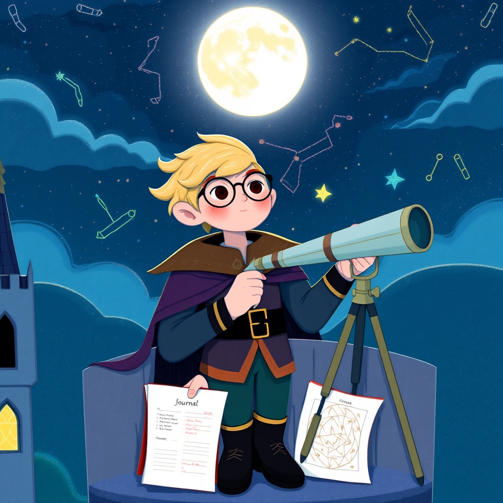 [Prince Leo](XC2NT5X3), the middle child, was fascinated by the stars. Every night, he climbed the tallest tower to look through his telescope and record constellations in his journal.