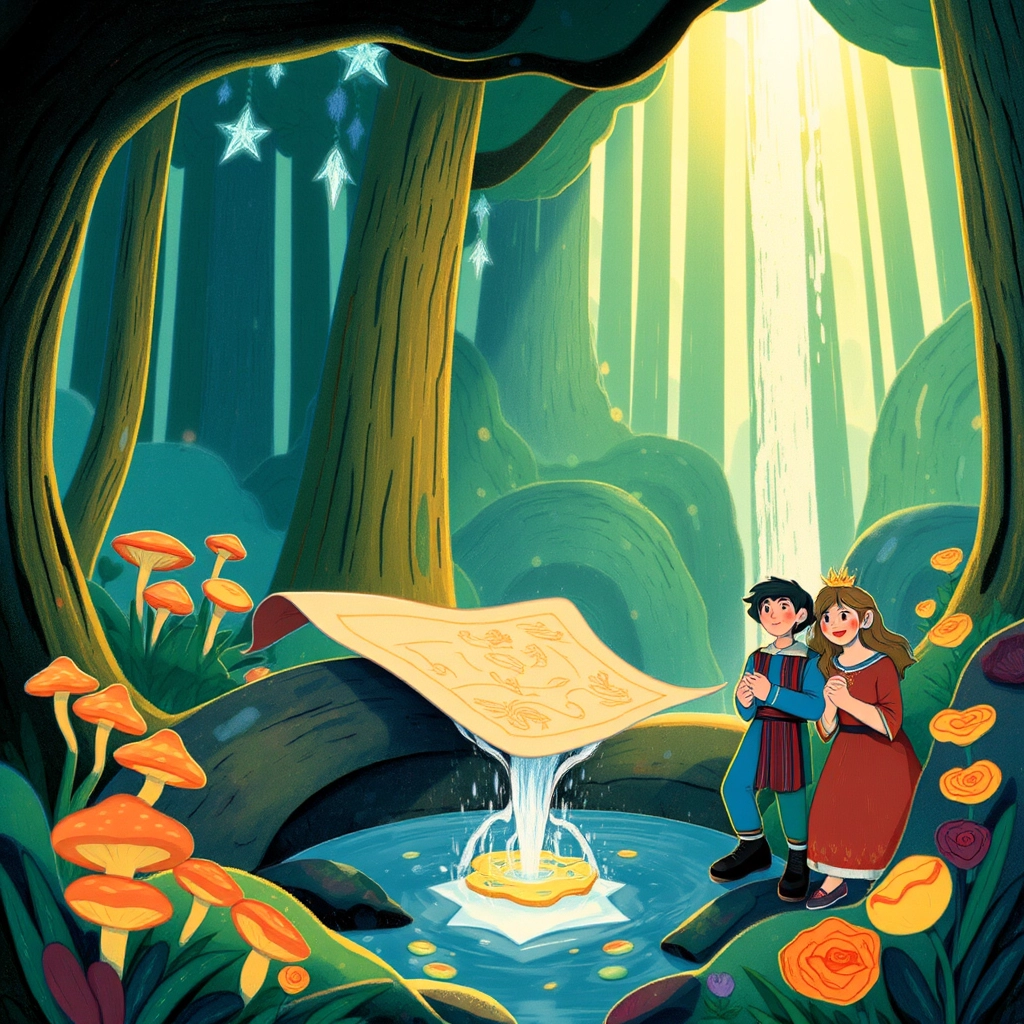 Finally, they reached the hidden forest. In the center, they discovered a sparkling fountain surrounded by trees with golden leaves. A scroll lay on the fountain, inscribed with a royal message.