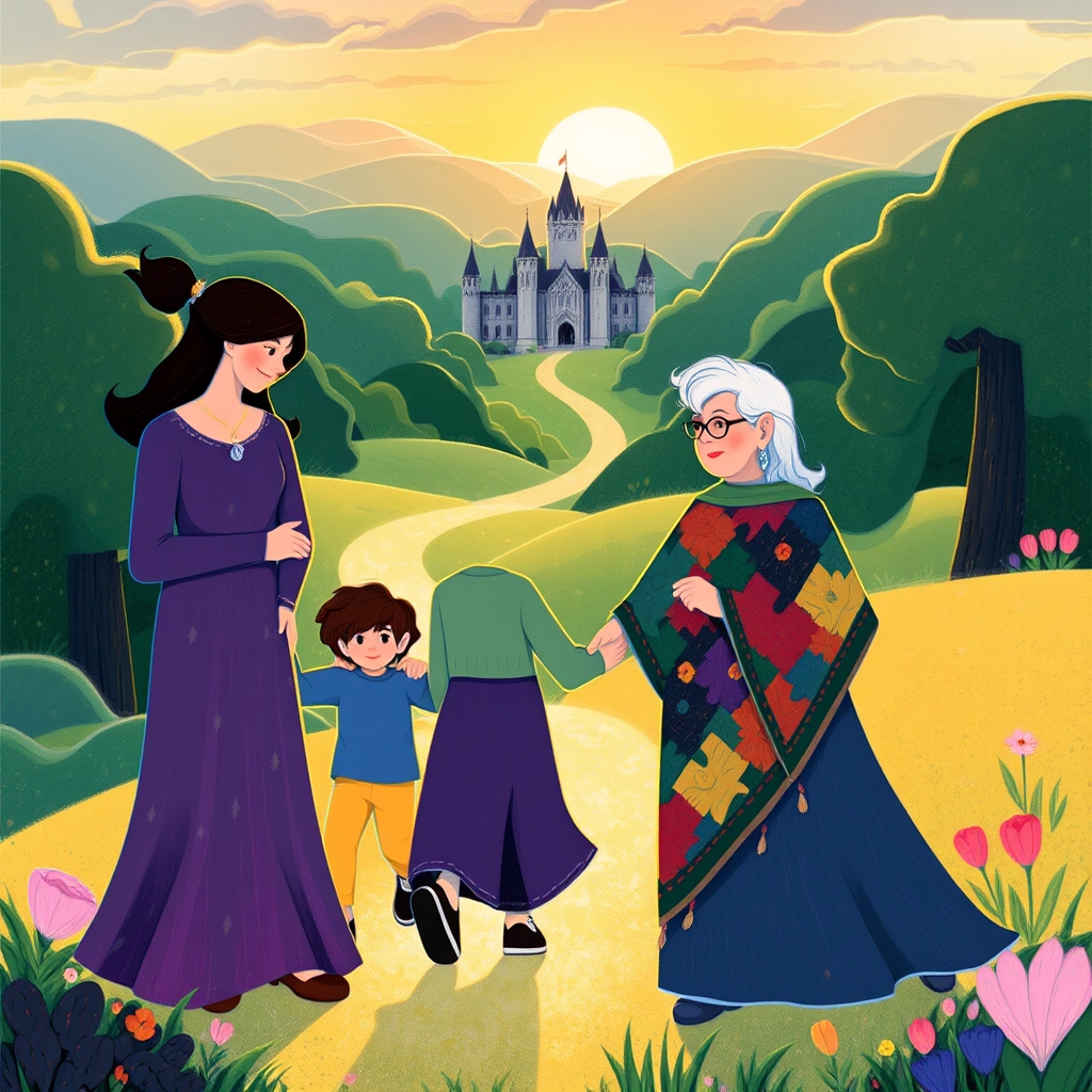 Lila and Oliver followed the glowing path with their mother and [Gran Mimi](GRHYR7DP). Along the way, they met friendly animals and picked colorful flowers.