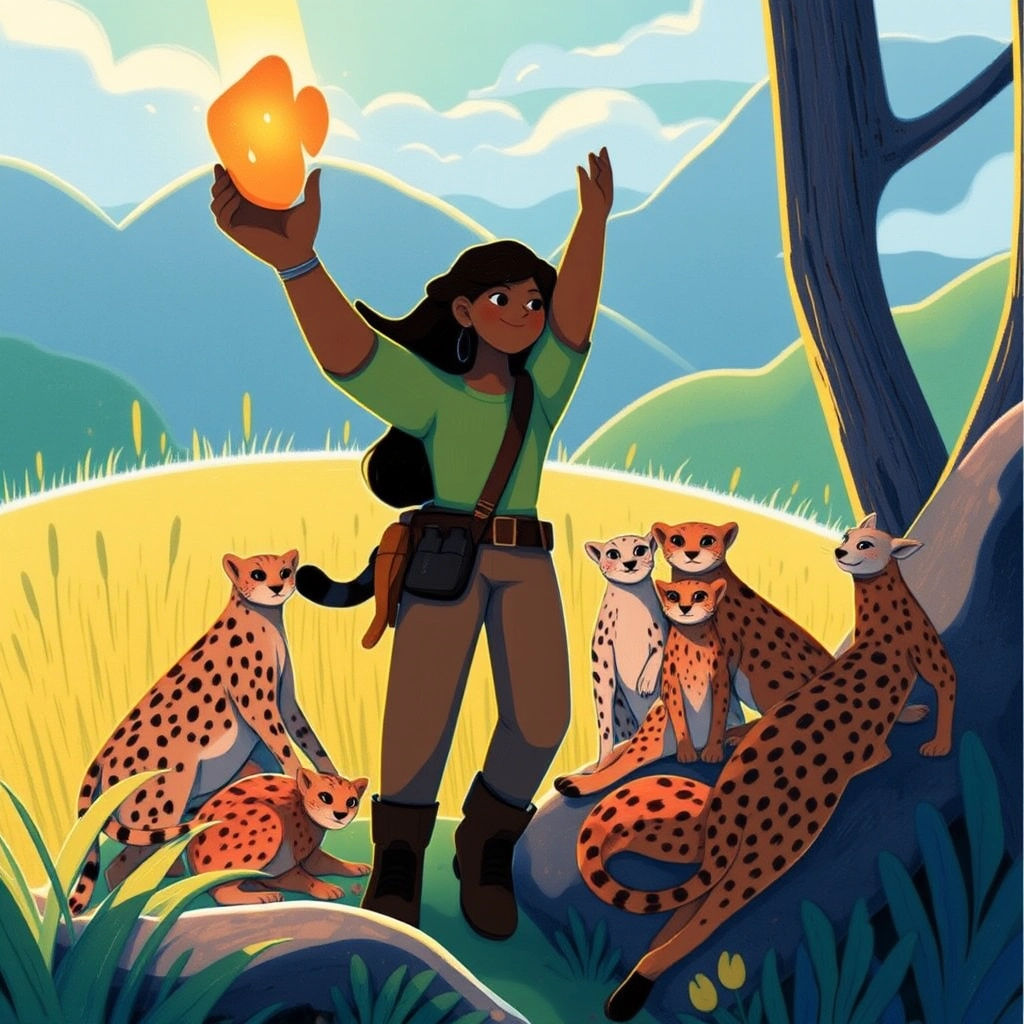 They cracked the riddle—cheetahs are the fastest! Following the cheetah's trail, they found the first Sacred Stone, glowing faintly in a hidden grove. A family of cheetahs watched them curiously, as [Maya](CKNS3G9R) explained how cheetahs have special adaptations for speed, like long legs and a flexible spine.