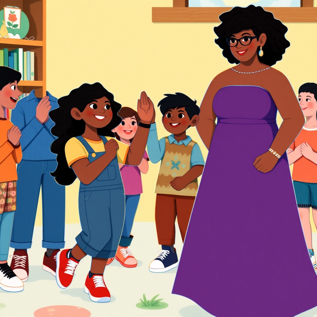 [Miss Bird](QFJKKJYZ), wearing her favorite purple dress and a big smile, clapped her hands. 'Alright class, today we're heading outside for an exploration adventure!' she announced. Everyone cheered and grabbed their gear for the journey.