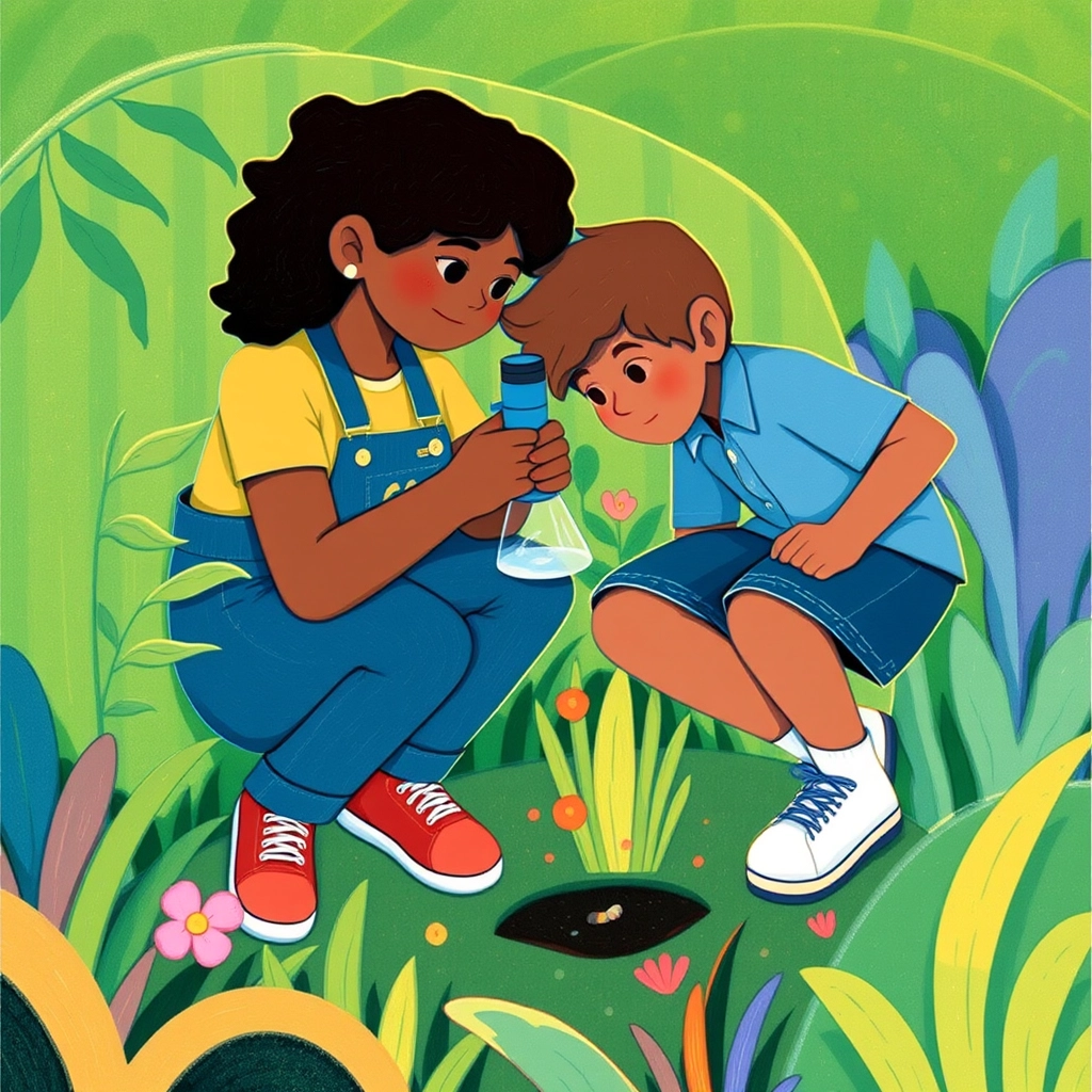 The two explorers searched high and low, parting blades of grass and peering under leaves. 'Do you think there’s one here?' [Tyler](HZJKTDPM) asked as they knelt near a bush. [Penny](FT4VKSGK) adjusted the microscope to get a better view.