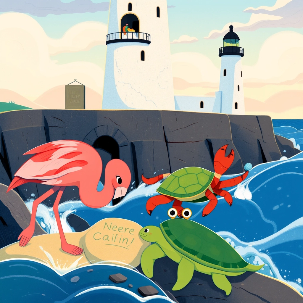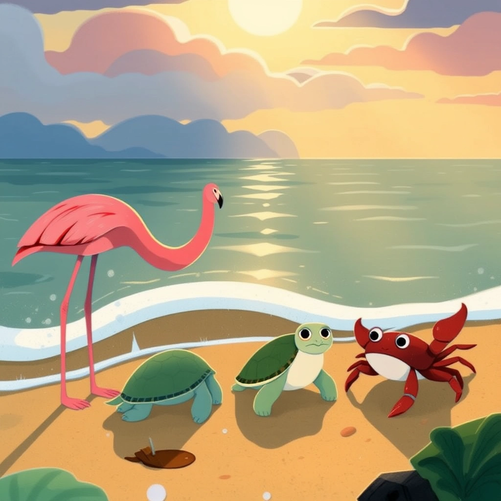 It was a bright sunny morning on the African seaside, and a group of friends were getting ready for their big day! [Neema](3NLJX6B5) the curious flamingo, [Bulo](3F7MVPL4) the wise turtle, and [Zuba](PL9PZB7Y) the energetic crab had heard about the legendary Coral Cove. Today, they had decided to find it!