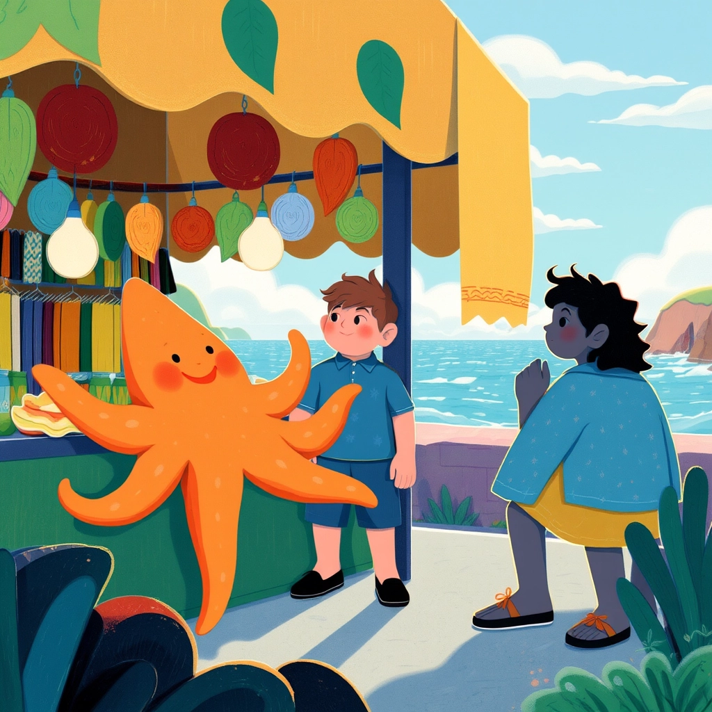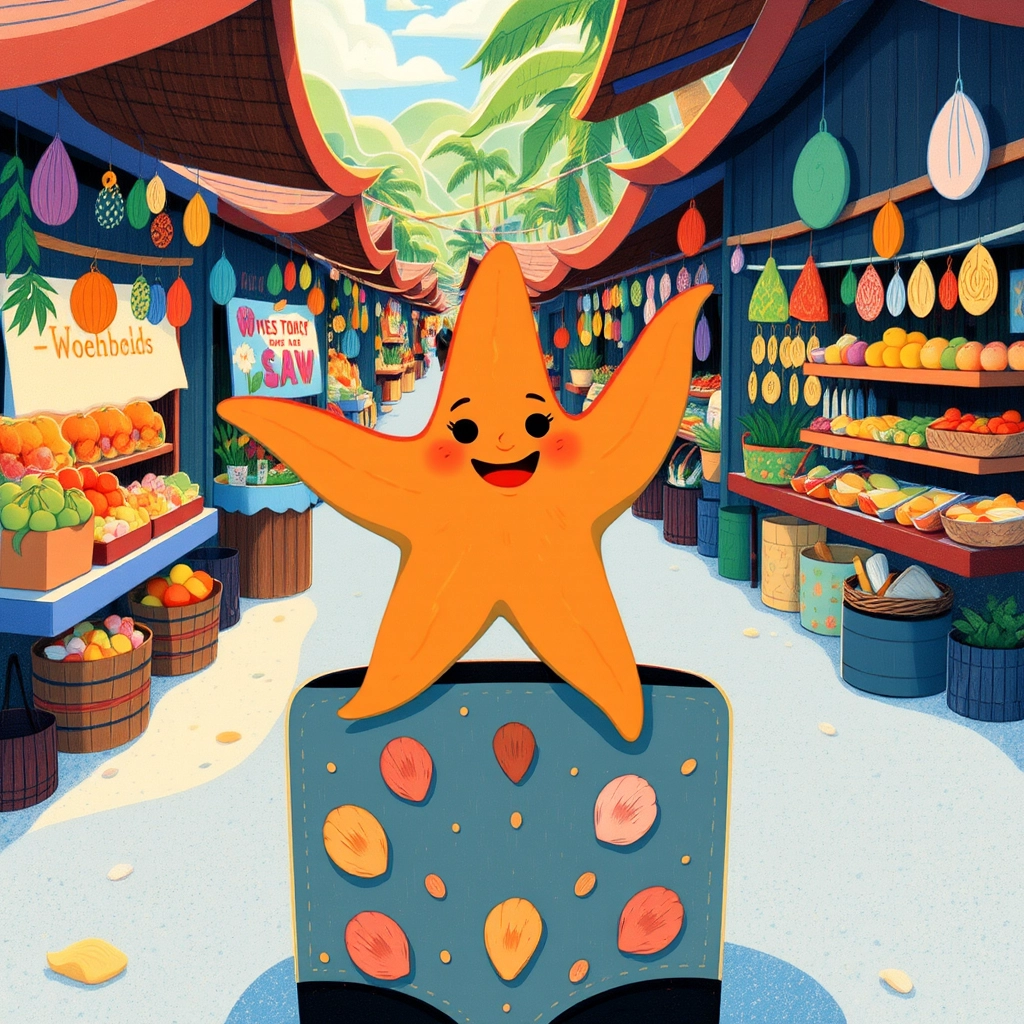 Their first clue led them to the seaside marketplace, bustling with sellers offering fresh fruits, colorful shells, and woven baskets. They spotted [Wema](N3VT9DMR), the cheerful starfish vendor, and decided to ask her for help finding their way.