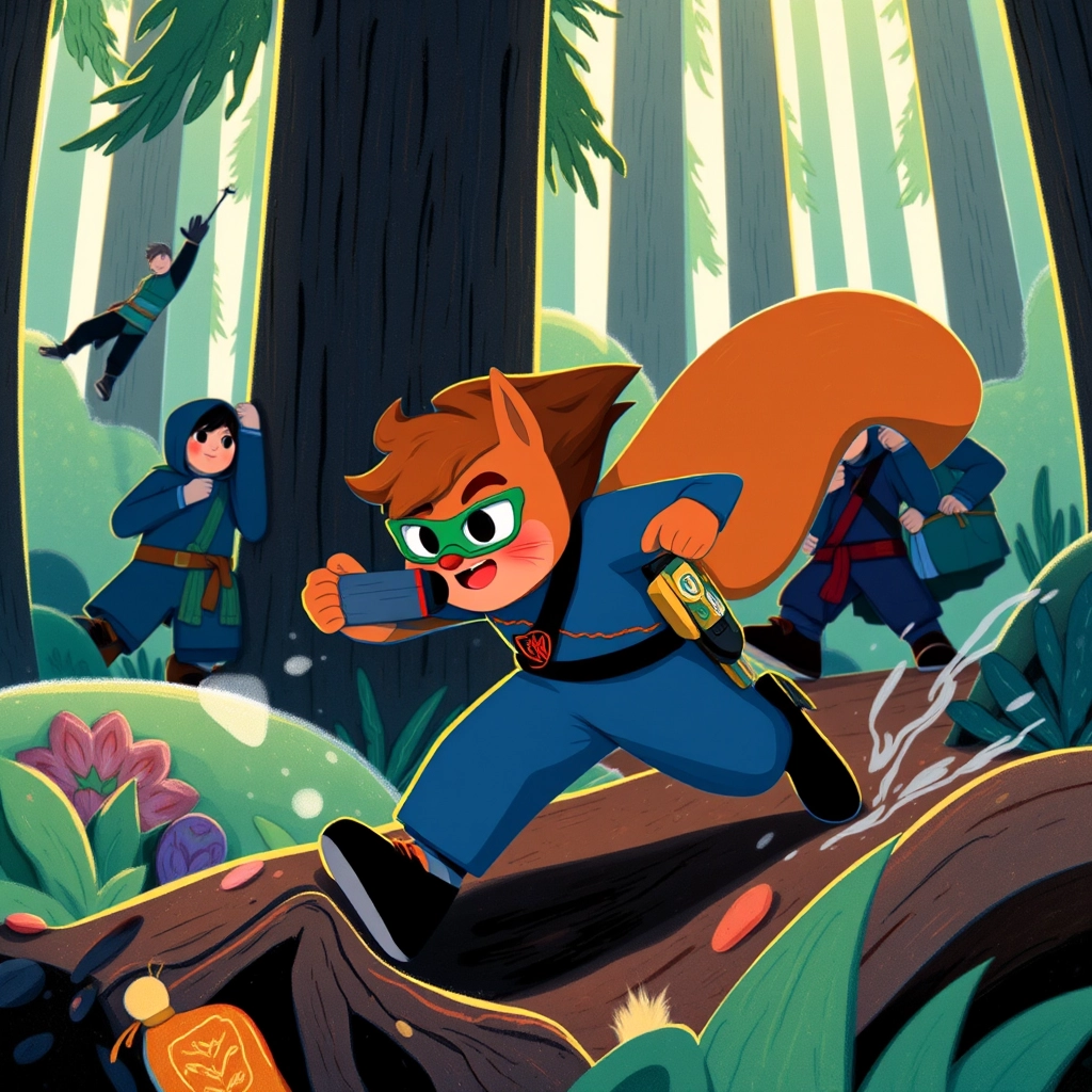 As they traveled further, a mischievous squirrel darted out, stealing [Kenji](9DXB5J34)’s gadget! 'Hey, that’s my grappling hook!' cried [Kenji](9DXB5J34), as they gave chase through a maze of trees.